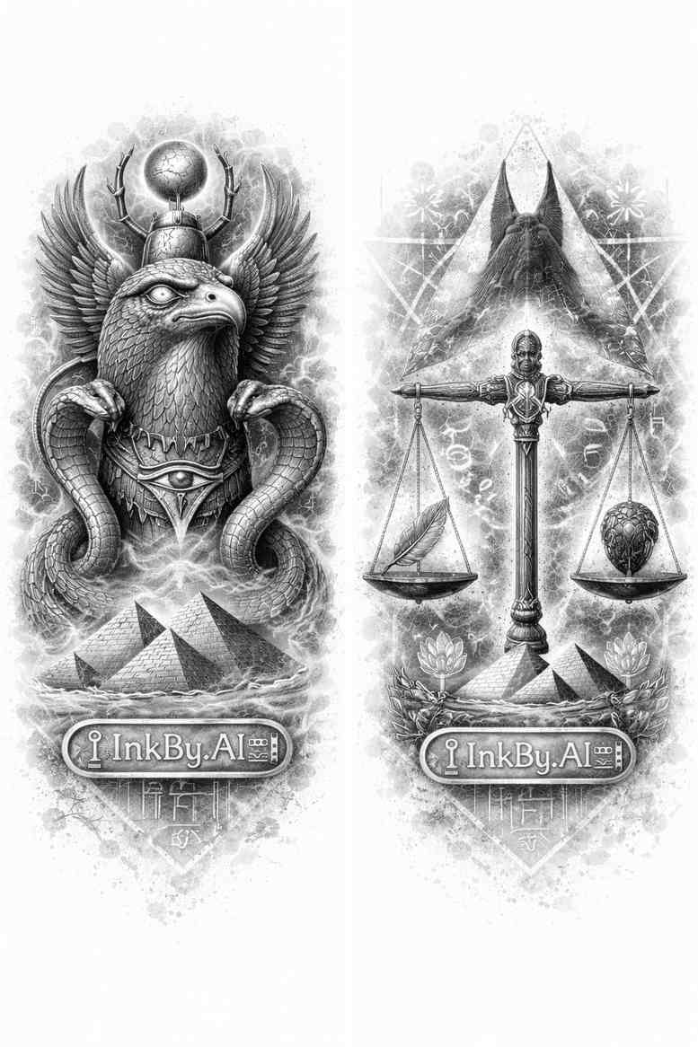 This two-panel tattoo design presents a contemplative angel on the left and a cross balanced on a traditional scale on the right, rendered in a precise black-and-grey palette. Executed in fine line technique, the piece relies on crisp contours, soft shading, and delicate textures to give the figures a lifelike, ethereal presence while preserving a timeless feel. The angel is depicted with modest wings, a flowing robe, and a subtle halo that glows against the light background, implying guardianship and compassion. The opposite panel features a stark cross perched above a balance beam, its arches and weights suggesting weighing of virtues and burdens, faith and doubt, or duty and mercy—a universal symbol of judgment and mercy. The composition is intentionally symmetrical, but the nuance comes from shading transitions and the negative space that frames each panel, allowing the design to breathe when placed on the arm, leg, back, or chest. The black-grey spectrum anchors the piece in a classical mood, while the fine-line execution ensures the tattoo ages gracefully and holds fine detail at different distances. Symbolism is subtle but clear: the angel offers protection and guidance, the cross anchors faith, and the scales introduce a moral dimension, inviting reflection about what we carry and what we value. For the wearer seeking a compact, meaningful narrative in a single or dual-panel format, this concept is ideal as a starting point for customization, linework refinement, or a broader sleeve. It also serves as a ready-made AI-generated concept that can be tailored with personal motifs should you want to adapt it for a cover-up or a new tattoo project. The design remains versatile across skin tones and placements, preserving its legibility and grace when scaled up or down and inviting further embellishment if desired. As an AI-generated concept, the artwork is designed for easy translation into tattoo practice, with clean vector-like lines suitable for stencils and fine shading passes. The design’s spacing supports crisp detail even when wrapped around a forearm or calf. Because of its dual-panel structure, it can be extended into a larger piece while maintaining coherence. In short, this is a thoughtful, enduring concept that blends spiritual symbolism with modern linework.