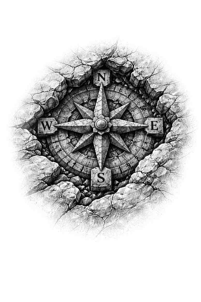 This blackwork compass rose tattoo design presents a bold focal point anchored by a four-armed star and crisp cardinal points, set within a dense, thorny ring that creates a dramatic boundary. The central compass is rendered with clean linear precision, using solid black fills for the needles and subtle cross-hatching to imply shading and depth without color. Surrounding the circle, a jagged ring of thorn-like elements adds texture and a hint of organic aggression, contrasting with the geometric regularity of the compass core. The overall composition emphasizes balance, direction, and resilience, common symbolic meanings for travelers, explorers, and seekers. The piece relies on negative space to preserve air around the points, making it adaptable to larger canvases such as the forearm, calf, or back. The style is unmistakably blackwork and relies on thick outlines, dense blacks, and careful line-work to maintain legibility as the tattoo ages. The concept nods to navigation charts and nautical iconography while remaining graphic rather than photo-realistic, which preserves readability in monochrome. The thorny outer ring provides an organic counterpoint to the rigid geometry of the compass, suggesting the coexistence of danger and guidance on any journey. This AI-generated concept is designed as a solid foundation for a tattoo project; it invites refinement in size, placement, and line weight by a seasoned artist, while the core idea—direction, protection, and perseverance—remains intact. The composition can be integrated with other motifs such as maps, waves, or dates, should a client wish to build a narrative around the compass motif. AI-generated design intent reflects a contemporary approach to navigation-inspired ink.