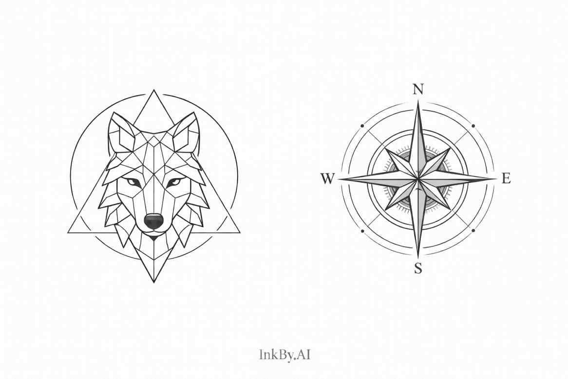 Geometric tattoo design featuring a wolf head and a compass, rendered in clean black linework with no shading, suitable for black and grey ink. On the left, the wolf is constructed from interlocking triangles and facets, giving a stylized, angular presence that conveys alertness, loyalty, and guarded energy. The negative space around the muzzle and ears creates a crisp silhouette that reads clearly at both small and large scales. On the right, the compass rose unfolds with radiating spokes, a central hub, and precise tick marks that suggest guidance, orientation, and a steady life course. The two motifs are balanced along a central axis, connected by shared negative space and a calm, even rhythm of line weight, establishing a cohesive, wearable composition. The monochrome palette emphasizes form over tone, allowing the geometry to tell the narrative of instinct versus direction and making the piece versatile for different skin tones and placements. Symbolically, the wolf embodies primal instinct, loyalty, courage, and guardianship, while the compass embodies navigation, purpose, and life choices; together they form a personal emblem of resilience, awareness, and deliberate action in a fast-moving world. The design embraces modern geometric aesthetics and fine-line technique, offering crisp readability from a distance and intricate detail up close, with tiny facets and spokes inviting closer inspection. Created as an AI-generated concept, it showcases how algorithmic planning can harmonize two disparate symbols into a unified tattoo design that remains legible when scaled and can be refined to a fuller sleeve or kept as a compact forearm piece. This concept is adaptable to various placements—forearm, upper arm, calf, or chest—and can be expanded with subtle decorative elements, such as micro-dots or additional geometry, should the client wish to grow the piece over time. Overall, the result is a stylish intersection of animal symbolism and navigation motif, framed by clean geometry that appeals to fans of contemporary linework, minimalist composition, and precise craftsmanship, while inviting personal interpretation through the balance of form and meaning.