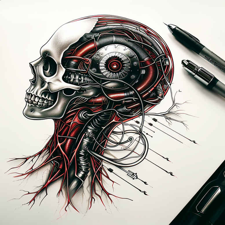An audacious biomechanical tattoo concept that blends anatomy and engineering into a single, cohesive piece. The design centers on a human skull, rendered in meticulous black and grey shading, whose cranium dissolves into an array of gears, tubing, and sinewy conduits. The interplay of solid shadows and fine line details creates a sense of depth and three-dimensional form, as if the wearer carries an internal machine beneath the skin. Circular gear elements—solenoids, pistons, and rotor-like rings—interlock with delicate cables, veins, and micro-splines, producing a visual language that sits at the crossroads of anatomy and industry. The red accents along some arteries provide a striking contrast that brings warmth to the otherwise monochrome palette, adding a focal point that catches the eye and invites closer inspection. The composition emphasizes a diagonal flow from the jaw upward into the cranium, guiding the viewer through layers of mechanical tissue while maintaining a readable silhouette for placement on the upper arm, chest, back, or calf. As a tattoo design, it operates well within black and grey conventions, but the red highlights lend a contemporary edge and can be scaled for small or large tattoos depending on the subject’s preferences. This concept is AI-generated, offering a high level of precision and imaginative fusion that can be refined by a skilled tattoo artist into a custom tattoo design. In the realm of meaningful tattoos, biomechanical motifs symbolize resilience, transformation, and the fusion of human and machine, appealing to fans of cyberpunk aesthetics, industrial art, and science-inspired body art. For collectors seeking a bold statement piece, the skull motif conveys mortality while the exposed machinery suggests resilience and an attitude of repair, making this concept particularly versatile for cover-up explorations or statement pieces. The repeating circuit-like elements introduce a pattern sensibility that can be accentuated or toned down to suit personal taste, and the design remains legible across a variety of body placements, from forearm to shoulder blade, making it a versatile platform for future expansions or additions to a larger biomechanics sleeve.