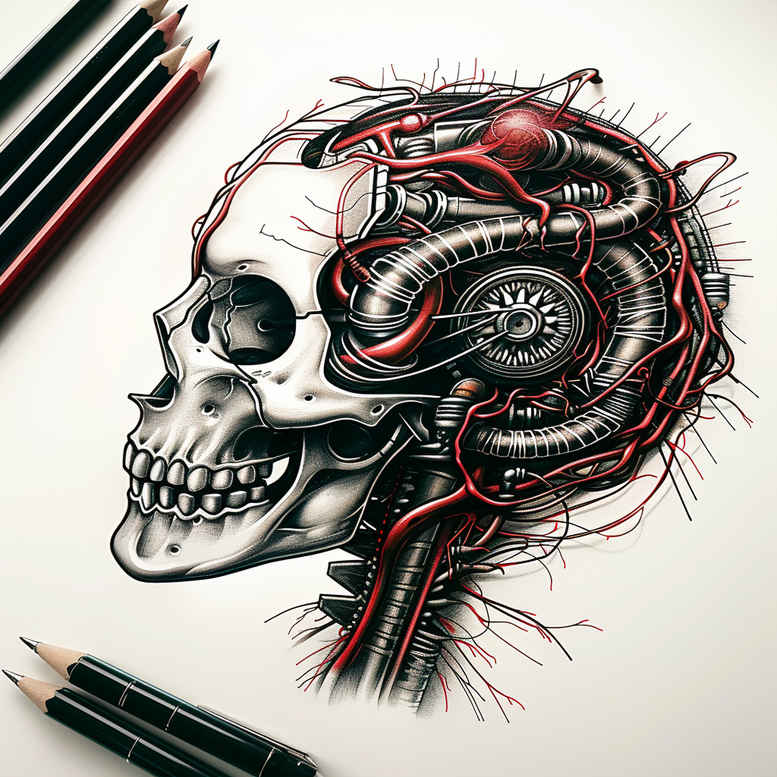Colored biomechanical tattoo design featuring a white skull seamlessly fused with red conduits, gears and tubework, presented as a high-contrast color study that explores the boundary between flesh and machine. The composition centers on an anatomically rendered skull, its cranium cracked open to reveal a cascade of sinewy cables and precision gears weaving around the jaw and temple. The vivid red tubing provides a bold accent against a grayscale base, guiding the eye along a serpentine path that imitates the flow of energy through a cybernetic spine. Shading emphasizes depth and texture—soft gradients along the cheekbone contrast with the hard, metallic gleam of gear teeth—creating a dynamic tension between organic form and engineered structure. This piece embodies biomechanics in tattoo form by fusing anatomical realism with mechanized elements, inviting viewers to read the design as a narrative of resilience and metamorphosis. The silhouette is strong enough for a chest, back, or sleeve, while the delicate linework inside the tubes and around the gears supports crisp reproduction on skin under varying lighting and aging. As an AI-generated concept, it serves as a starting point for a custom tattoo design, offering a tangible template for artists to interpret, refine, and personalize to individual anatomy and style. For collectors seeking meaningful tattoos that blend anatomy with cybernetics, this piece presents a compelling direction that emphasizes motion, energy, and the fusion of flesh with machinery, while maintaining readability and longevity of linework over time. This design captures the essence of the biomechanical genre, combining graphic precision with a bold color accent to create a striking body art statement that translates well across placements and sizes.
