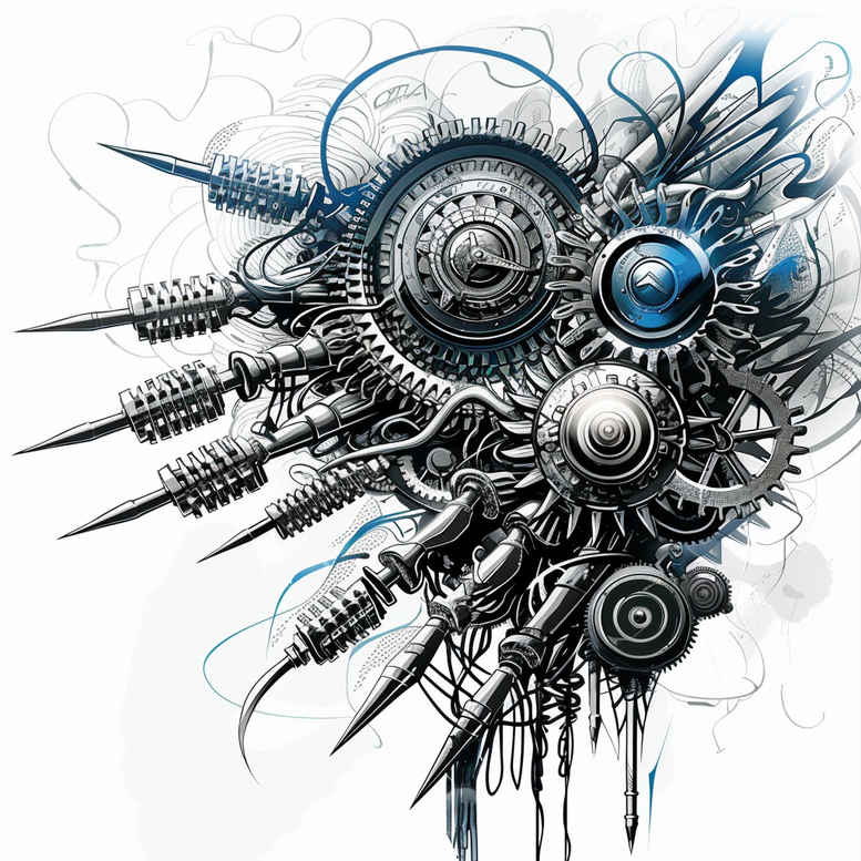 Biomechanical tattoo design features a dense cluster of interlocking gears, cog wheels and sharp spines that fuse into an organic machine form around a striking blue eye. The composition reads as a study in contrast, with bold black linework defining the mechanical skeleton while soft shading suggests depth and curvature beneath the skin. A central mass of gears anchors the piece, with mechanical filaments extending outward in a rhythmic arc that could wrap across the shoulder, chest or forearm. Repeating motifs of cogs and serrated elements create a hypnotic pattern that guides the eye along a timeline of motion, a nod to the fusion of flesh and machine. The biomechanical style blends industrial aesthetics with anatomical suggestion, producing a body art piece that feels both futuristic and timeless. The color accent of a single blue eye provides a focal point against the grayscale machinery, enhancing contrast and emotional resonance. For those pursuing meaningful tattoos, this concept demonstrates how refined linework and negative space can preserve readability on different body parts while maintaining dense texture. As a concept piece, it offers clear direction for a custom tattoo design, ready for adaptation by a skilled artist into a wearable work of art. The image also reflects current biomechanical trends in tattoo art, and may inspire commissions that emphasize contrast, motion and the dialogue between biology and engineering. Note that AI-generated inspiration may have influenced the initial concept, with professional tattoo artists translating it into a final, client-ready design. The piece leverages negative space to ensure legibility when scaled, and the interplay between metal and skin evokes resilience and metamorphosis.