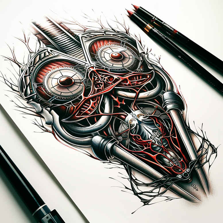 Black and grey biomechanical heart tattoo design fuses anatomy with industrial elements, weaving gears, pistons, and tubing into a living machine that seems to breathe with the wearer. The heart silhouette dominates the composition, while interlocking gears and slender wires trace along the chest’s curves, creating depth and motion. Bold outer contours meet fine line work—gear teeth, rivets, and mesh render at varying scales, inviting close study of the mechanical textures. Red accents highlight joints and veins, adding focal points without breaking the monochrome aesthetic. This biomechanical concept embodies biology meeting machinery, symbolizing resilience, transformation, and the hidden systems powering the body. Its density makes it ideal for larger placements like the chest or back, where the gears can wind with muscle and bone. The design originated as AI-generated ideation and was refined by an artist to balance readability with technical detail, ensuring strong lines in ink. As a cover-up-ready piece, it uses heavy black areas to mask blemishes while delivering a bold graphic statement in body art. For those seeking meaningful tattoos, the biomechanical heart offers a striking fusion of form and function in black and grey ink.