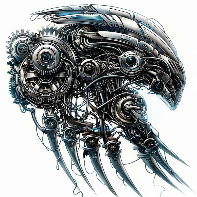 Biomechanical tattoo design featuring a chrome head assembled from gears, tubes, wires, and screws, merging organic form with industrial machinery in a dynamic, forward-leaning composition. The color palette relies on cool blue highlights and metallic grayscale tones, creating a sense of precision and high-tech realism that is characteristic of biomechanical tattoo aesthetics. The head is rendered as a close portrait of mechanical anatomy, with interlocking gears serving as cranial plates, serpentine tubes bridging the jaw and temple, and fine wires tracing nerves across the surface. Crisp line work and subtle gradations of shade simulate brushed steel and polished chrome, while negative space carves light pockets that enhance volume and depth. Repeating motifs of cog wheels, pistons, and tubing establish a consistent pattern throughout the piece, guiding the eye along the contours of the skull and reinforcing the industrial rhythm that defines biomechanical work. The composition emphasizes a central focal point on the brow and temple, with secondary zones along the cheek and neck that echo the same mechanical language, creating a balanced, scalable design suitable for a large back, chest, or sleeve. This tattoo invites contemplation of the relationship between human biology and engineered systems, exploring themes of resilience, evolution, and the merging of flesh with machine. For tattoo enthusiasts, it offers a bold, statement-making option, with blue accents that delineate each component and enhance legibility from a distance. The concept, occasionally AI-generated, demonstrates a contemporary approach to biomechanical tattoo design by blending realism in the machinery with stylized accentuation, producing a highly graphic yet expressive body art narrative. The piece can be adapted to different anatomical areas while preserving its dramatic pattern and the tension between organic curves and rigid hardware, making it a compelling centerpiece for any biomechanical collection, and a strong candidate for future collaborations with geometric and abstract tattoo studies.