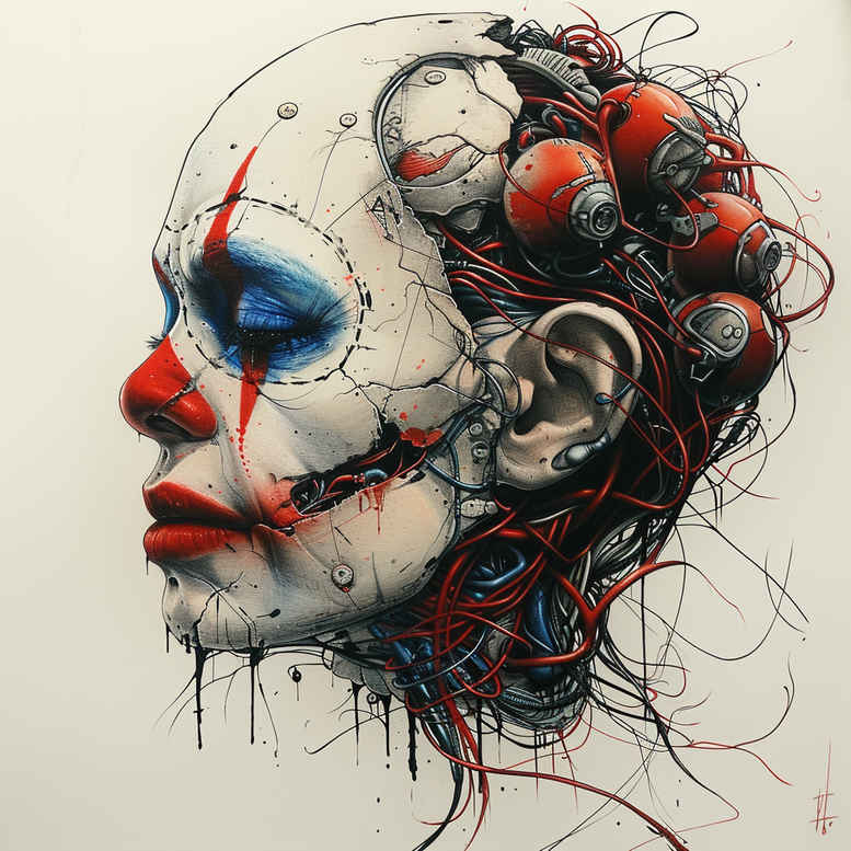 This biomechanical portrait tattoo design fuses organic flesh textures with precise cybernetic components to create a striking side-profile composition. The focal point is a woman’s head rendered with pale skin, bold red lips and a blue accent around the eye, evoking a dramatic makeup motif. Surrounding the head, an intricate network of tubes, wires and segmented gears appears to emerge from the scalp and hair, weaving into the anatomy to suggest a seamless fusion of biology and machine. The color palette emphasizes high-contrast reds and blues against a subdued skin tone, allowing the circuitry to pop while preserving lifelike skin texture. Light and shadow are carefully modulated to produce a three-dimensional illusion; the fine linework and cross-hatching recall both tattoo realism and graphic machine aesthetics. The composition relies on a strong profile silhouette, with negative space framing the jaw and neck, and the mechanical elements curling around the ear and temple to convey motion and energy. Symbolically, the design explores augmentation, resilience, and the dialogue between humanity and technology—an enduring motif for meaningful tattoos that examine identity and transformation. This tattoo concept is AI-generated, offering a contemporary take on classic biomechanical tattoo design, and would suit a bold statement on the upper arm, shoulder blade, or chest for those seeking a dramatic but refined body art piece. In a magazine-ready presentation, the piece balances realism and surrealism, functioning as both a stand-alone artwork and a narrative symbol within a larger sleeve. This design also emphasizes texture contrasts between smooth skin and metallic surfaces, with gloss highlights that read as chrome and solder. The hair forms a natural frame for the machinery, and the concept provides a versatile blueprint for a custom tattoo design adaptable to arm, back, or chest canvases. AI-generated concept, intended for inspiration in professional tattoo studios.