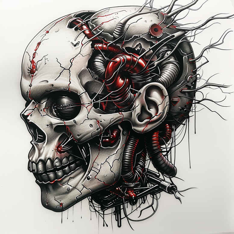 Biomechanical skull tattoo design that seamlessly blends bone anatomy with engineered hardware, this piece reads as a fusion of flesh and alloy. The composition places a stark, anatomically accurate skull at the center, wrapped by a lattice of cables, pistons, and segmented gears that appear to grow from the skull like metallic bones. The linework is precise and clean, with high-contrast shading that creates depth in the eye socket and along the jaw, while subtle red accents trace through the circuitry-like pathways weaving through metal and bone. The color palette remains primarily monochrome, but the red highlights provide a striking focal point, evoking energy, life, and a hint of danger within the mechanical mass. The design leans into biomechanical tattoo design motifs: the deconstruction of organic form, the seamless integration of machinery with anatomy, and the sense of motion implied by tangled conduits and rotating gears. The composition is balanced yet dynamic, with the mandible anchoring the lower third as wiring spirals toward the crown, allowing a skilled artist to adapt it for chest, back, or sleeve work. The inspiration draws from both classic blackwork and modern geometric lines, creating a tactile texture that reads well at various scales. For clients seeking meaningful tattoos, this concept communicates resilience and the fusion of human and machine, offering a narrative about evolution and adaptation. The piece also explores the interplay between light and shadow, using negative space to emphasize the skull’s structure while the metallic elements reflect imagined sources of illumination. While the current rendering presents a vibrant color accent, the underlying linework supports a fully grayscale or high-contrast variant, giving practitioners flexibility in execution. As an AI-generated concept, it provides a robust foundation for a custom tattoo design that a tattoo artist can tailor to individual anatomy and skin tone, ensuring a unique, enduring body art statement.