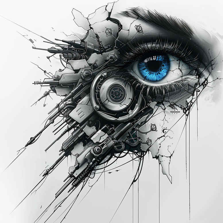 AI-generated biomechanical eye tattoo design blending gears and circuitry into a lifelike ocular form. The central feature is a vivid blue iris surrounded by dense black and grey shading that creates a dramatic, high-contrast composition. Mechanical components curve along the orbital contour, with gears, pistons, and fine wire accents forming a dynamic radiating pattern that suggests motion and depth. The outer skin around the eye reads as fractured, industrial armor, giving the piece a sculpture-like presence. The linework is precise yet expansive, balancing sharp silhouettes with smooth gradations to ensure legibility on a large canvas while revealing intricate details up close. The design fuses futuristic machinery with organic anatomy, symbolizing resilience, human-machine synergy, and the union of nature and industry—an ideal choice for those seeking meaningful tattoos. Because this is a dark, heavily shaded concept, it is well suited for cover-up work, offering strong camouflage for existing tattoos or scars while the blue iris provides a memorable focal point. The palette remains predominantly black and grey, with a singular blue accent that reads as a signature highlight. This biomechanical tattoo design aligns with current trends in fine line-work and bold silhouettes, making it a versatile blueprint for a custom tattoo design on the shoulder, chest, or back. The description also notes the AI-generated origin of the concept, underscoring how technology can accelerate ideation and collaboration with clients in a modern tattoo studio context. Artists can expand the mechanical frame with additional modules along the brow or temple and integrate subtle shading, giving a three-dimensional impression. The composition emphasizes a circular core and radiating elements, allowing a future extension into a sleeve with complementary components such as winged gears or circuit-like filigree. The choice of blue as the iris color anchors the design and supports a vibrant accent without overpowering the grayscale machinery. For search optimization, the text includes keywords like tattoo, tattoo design, biomechanical, black and grey, blue, eye, gears, machinery, ink, and meaningful tattoos to attract clients seeking bold, technology-inspired artwork. In the context of meaning, this concept resonates with themes of transformation, endurance, and the fusion of human physiology with machinery, representing a forward-looking attitude toward body art. The approach is scalable for both small, daily-wear looks and large, gallery-like placements, enabling artists to dial details up or down according to the skin surface. Finally, the AI-generated label acknowledges the growing role of algorithmic design in contemporary tattoo practice, inviting clients to engage with digital prototypes before committing to the final inking.
