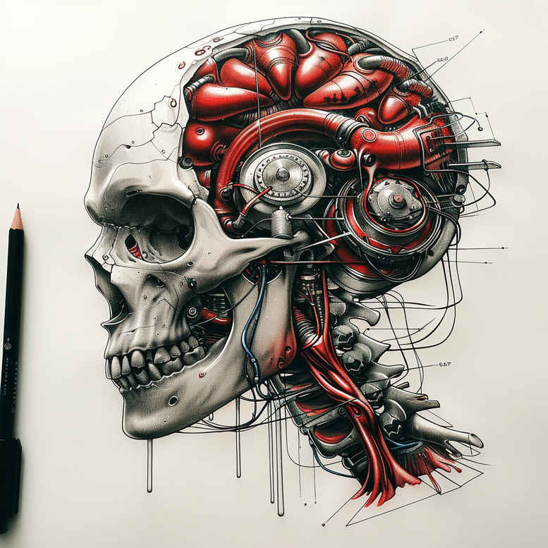 Biomachine aesthetic, the biomechanics style merges anatomy with engineered detail to create a striking body art concept. This tattoo design centers on a half-skeletal skull where the left side remains organic while the right side reveals a hyper-detailed mechanical core, exposing gears, tubes and wiring that resemble an inner circuitry. The composition plays with negative space and precise linework to create depth, contrast, and a sense of motion, as if the machine is breathing life into bone. The black and grey shading enhances the three‑dimensional feel, with careful cross-hatching and subtle highlight work that makes the metal components shimmer. The red accent in the brain area adds a focal point, drawing the eye to the fusion between biology and machinery, a recurring theme in biometric tattoo design. The artwork balances macro and micro details: large skull silhouette anchors the piece while minute gears and pistons populate the right hemisphere, inviting prolonged study. The right side’s mechanical anatomy is composed of circular gears, segmented tubes, and slender pistons that telescope along the jawline, while the left retains natural bone texture and subtle sutures. This duality creates a dynamic tension that reads as a single, cohesive motif when wrapped around a limb or torso, and it scales well from a compact forearm piece to a full-sleeve composition. Symbolically, it can be interpreted as resilience through adaptation, the coexistence of organic life and engineered precision, and a commentary on modern identity in a tech-saturated era. The design also nods to industrial and cybernetic aesthetics, drawing from classic biomechanical tropes as well as contemporary tattoo language, so it appeals to aficionados of fine line detailing, heavy shading, and high-contrast imagery. For clients seeking a meaningful tattoo, it offers a narrative about transformation, with a strong focal point in the brain‑gear fusion that can be interpreted as intellect meeting machinery. This concept is AI-generated as a starting point, but a skilled tattoo artist would refine line weights, proportion, and shading to match individual anatomy, skin tone, and preferred scale, ensuring a durable, timeless body art piece.