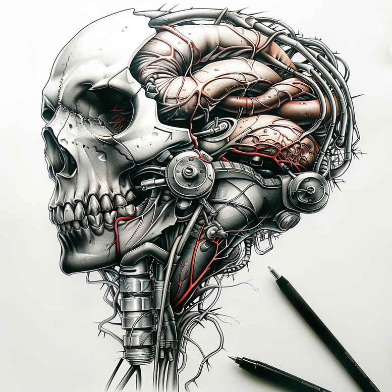 This biomechanical tattoo design combines anatomical realism with industrial machinery to create a haunting fusion of flesh and steel. The profile centers on a skull and cervical spine, rendered with meticulous cross-hatching and smooth gradient shading to achieve a lifelike yet otherworldly appearance. Around the cranium and along the neck, interlocking gears, pistons, cables, and riveted plates weave through bone, creating a sense of motion and hidden mechanics beneath the surface. The composition emphasizes negative space and directional linework to guide the eye from the jaw to the base of the neck, while high-contrast blacks anchor the piece and lighter greys reveal intricate detailing in the gears and tubing. Symbolically, biomechanical tattoo designs like this speak to themes of transformation, resilience, and the merging of humanity with technology, a nod to endurance and the modern human condition. The piece works well on the side of the head, neck, or shoulder blade areas where curvature can enhance the three-dimensional illusion. In terms of style, the artwork leans toward a graphic realism within the biomechanics genre, employing crisp outlines and soft shading to mimic metal surfaces and bone texture. For clients seeking a statement piece, this concept offers a bold, long-form canvas with age-appropriate detail that remains legible over time. While the design uses many mechanical elements, the underlying anatomy remains readable, allowing the wearer to interpret the imagery personally—perhaps as a commentary on inner strength, adaptation, or the relentless forward march of progress. AI-generated inspiration shaped the initial layout, but skilled tattoo artists can adapt the placement to suit individual anatomy, skin tone, and personal symbolism. This piece is a strong example of a modern tattoo design that blends scientific illustration with visionary art, making it a meaningful choice for those pursuing memorable, customized body art.