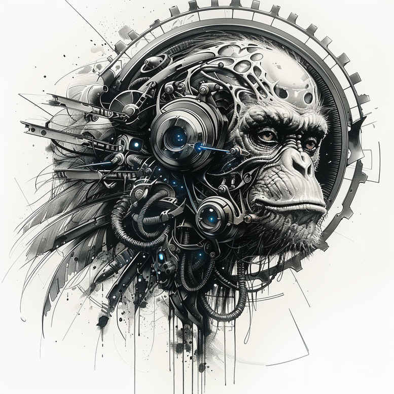 Biomechanical monkey head tattoo design merges flesh and machine in a kinetic portrait, exploring the boundary between organic form and engineered precision. Dominated by a stylized monkey cranium wrapped in interlocking gears, pistons, and skeletal tubing, the composition unfolds in a circular flow that echoes clockwork and anatomy. The high-contrast black and grey palette emphasizes deep shadows and crisp highlights, allowing the metal surfaces to gleam against the dark void, while negative space around the periphery lends breathing room to the complex circuitry. This biomechanical tattoo design fuses surreal anatomy with graphic geometry, creating a dynamic focal point suitable for a large sleeve or chest piece. The interplay of organic texture and mechanical density conveys themes of resilience, metamorphosis, and the fusion of nature with technology, inviting interpretation about the ancient origins of tool-making and the modern quest for augmentation. For tattoo enthusiasts seeking meaningful tattoos, this concept offers strong visual impact, legibility, and longevity, with clean lines that read clearly from a distance and intricately detailed shading up close. It is offered as a custom tattoo design and is AI-generated for concept exploration; final inking can be tailored to fit the chosen placement, whether as a standalone centerpiece or integrated with other biomechanical elements. If a cover-up is contemplated, the dense black mass and defined silhouette can efficiently obscure underlying tattoos while preserving the striking gear-driven aesthetic. The design’s mechanical motifs—gears, cog-like rings, and structural tubing—form a repeating pattern of interlocking components that can be adapted or expanded in future sessions, making it ideal for pattern-oriented tattoo projects or as a starting point for a larger biomechanical narrative. This piece exemplifies the biomechanical genre with bold contrast, meticulous line work, and a timeless grayscale finish that remains legible on skin over time, while the AI-generated concept underscores modern approaches to exploring meaning and form in body art, ensuring it remains a compelling option for collectors seeking a dramatic, conversation-worthy tattoo design.