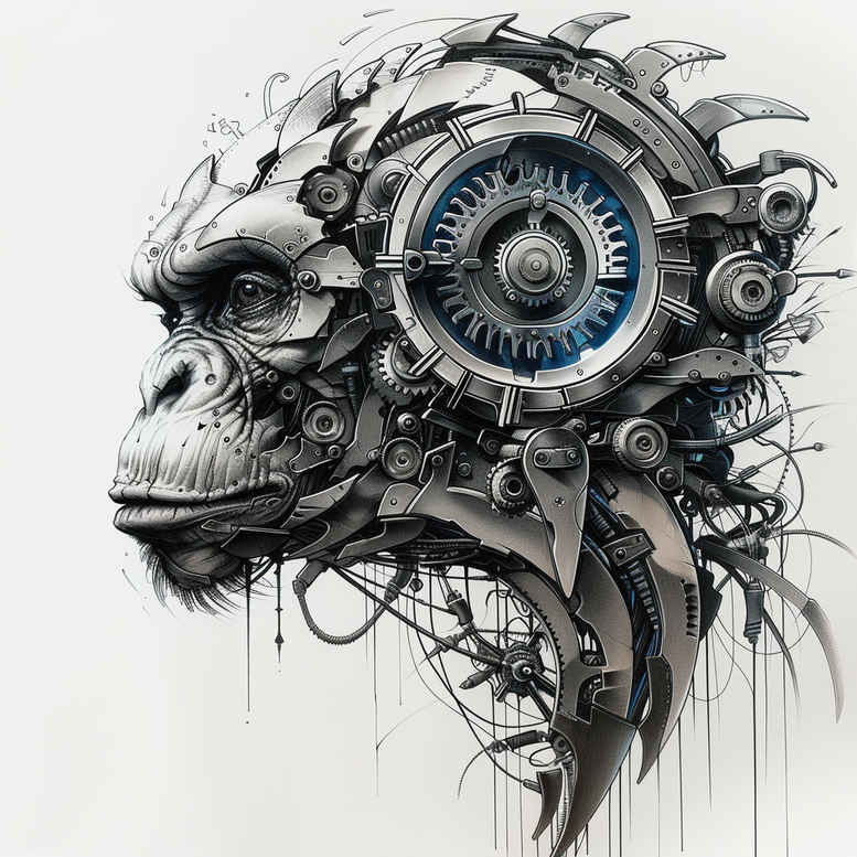 From a professional perspective, this biomechanical gorilla head tattoo design fuses organic form with industrial mechanics in a seamless composition. The artist renders a powerful primate profile in monochrome grayscale, letting negative space and careful shading carve the muscle contours while a lattice of gears and metallic plates threads across the skull. The design balances weight and motion: the jawline and brow ridge retain animal expression, while mechanical elements wrap around the cranium like an exoskeleton, suggesting strength, resilience, and the fusion of biology with engineering. The gear elements read as a microcosm of precision craft; each cog interlocks with the next, creating rhythm and texture that rewards close inspection. Fine line detailing outlines wire-thin connections between plates and skin, while broader blacks anchor the silhouette and provide dramatic contrast. The black and grey palette emphasizes volume, depth, and tactile detail, with high-contrast blacks grounding the form and midtones shaping the gears, plates, and sutures to convey three-dimensional form on the skin. The diagonal flow of the composition guides the eye from the forehead toward the jaw, allowing the design to wrap naturally along the shoulder or chest when tattooed, making it versatile for placement. Symbolically, the fusion of primal anatomy with mechanical elements evokes themes of augmentation, resilience, and the relationship between nature and machine, appealing to fans of biomechanics, industrial aesthetics, and dramatic animal portraits. This concept is presented as an AI-generated starting point for a custom tattoo design, inviting refinement by an experienced tattoo artist to tailor line weight, shading, and scale to the client’s anatomy and skin tone.