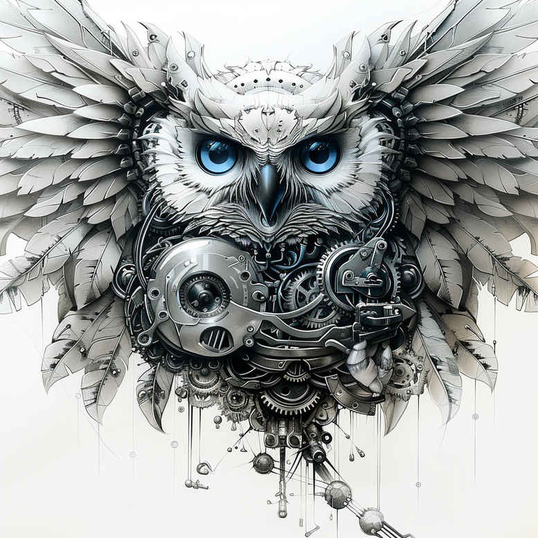 This biomechanical owl tattoo design fuses organic feathered detail with industrial machinery, creating a striking tension between nature and machine. The central owl head is rendered with meticulous line work and shading that builds a lifelike expression, while interlocking gears, pistons, and tubing replace conventional anatomy to evoke a futuristic survival of the fittest. The wings unfold in a sculptural composition, their feathers transitioning into metallic plates and cog motifs, giving the impression that the creature is both guardian and engine. Subtle splatters and fine line highlights simulate wear and motion, while deep blacks and midtones establish a bold yet refined black and grey palette. The owl’s piercing blue irises stand out against the grayscale environment, adding a focal point and a touch of mystique. The overall design balances symmetry with organic irregularities, guiding the eye from the beak through the chest to the extended wings, a flow well-suited for a back, chest, or shoulder sleeve. Symbolically, the owl embodies wisdom and vigilance, while the biomechanical elements speak to human ingenuity, resilience, and the fusion of biology with technology—concepts that resonate with fans of meaningful tattoos and science-fiction aesthetics. From a technical perspective, the piece relies on crisp contour lines, layered shading, and negative space to preserve readability when wrapped around curves, with gear detailing that invites close inspection. This concept is AI-generated and intended as a blueprint for a custom tattoo design; skilled artists can adapt it into a large, high-contrast tattoo that remains legible over time. In short, this tattoo marries natural elegance with industrial edge, producing a compelling biomechanical statement piece for aficionados of fine line and realism within a bold grayscale framework.