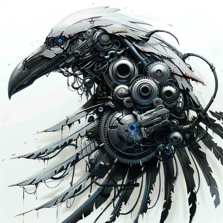 This biomechanical raven tattoo design presents a striking fusion of organic architecture and engineered precision. The raven’s silhouette is carved from interlocking gears, pistons, and fluid metallic plates that mimic bone and feather, creating a seamless transition between living anatomy and machine anatomy. The piece emphasizes a monochrome palette of black and grey, with deep tonal contrasts that highlight negative space and the intricate circuitry that traces along the neck, chest, and wing outlines. The composition centers the raven’s head as a focal point, surrounded by layered gear clusters that suggest movement and hidden mechanics beneath the skin, while slender turbine-inspired elements weave through the wing tips to imply propulsion. The overall aesthetic sits firmly in biomechanical tattoo design, leveraging the tension between hard metal and delicate feather-like shapes to evoke resilience and transformation. The style borrows from both industrial design and natural animal imagery, producing a tattoo that reads both as sculpture and anatomy study. The repeating circular gears function as a subtle pattern, inviting the eye to follow congruent rings and spokes across the canvas, a hallmark of pattern-conscious biomechanical work. This design is ideal for coverage, as the dense black areas and large interlocking motifs naturally conceal underlying skin imperfections, making it a strong candidate for a cover-up tattoo. The image also nods to modern ink techniques and is suitable for clients seeking a bold statement with longevity, while remaining adaptable for various skin tones. AI-generated concept notes are integrated into the composition, offering a futuristic interpretation of the raven that resonates with enthusiasts of mechanical art and meaningful tattoos. In a professional setting, this tattoo design can anchor a sleeve or back piece, pairing with geometric lines or additional fauna to build a comprehensive biomechanical narrative about transformation and resilience. Symbolically, the raven in biomechanical form channels ideas of adaptation, intelligence, and resilience, while the exposed gearing alludes to inner mechanisms that drive growth. The monochrome treatment ensures a timeless aesthetic, enabling the wearer to pair this piece with fine line elements or larger geometric components as a custom tattoo design. The composition balances crowded mechanical detail with clean silhouette to ensure readability from a distance as well as up close, making it suitable for both small tattoos and larger installations, depending on placement preferences. The concept remains faithful to the biomechanical vocabulary while leaving room for personal reinterpretation, a common goal in modern tattoo design.