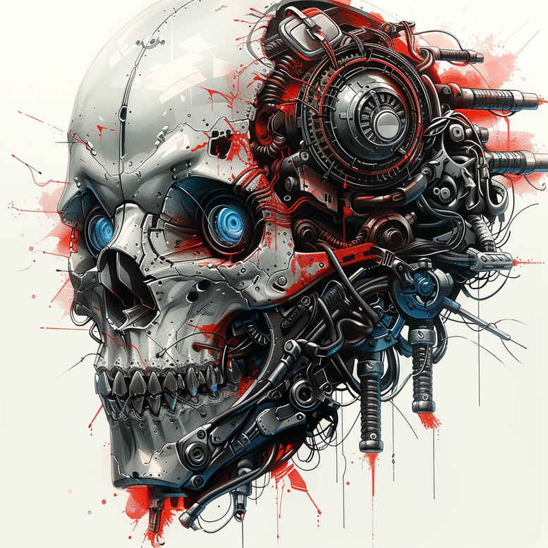 This biomechanical skull tattoo design fuses anatomy with machine elements, balancing a stark grayscale palette with vibrant red accents to draw the eye along a flowing composition. The central motif is a realistically rendered skull in black and grey, anchored by a dense field of gears, pistons, and cables that emerge from the right side and weave across the jawline. Subtle blue shading highlights the eye socket, creating a cool focal point that contrasts with warm red highlight strokes and the iron-gray chrome of the machinery. The artist employs a mix of sharp linework and smooth gradient shading to simulate metal surfaces, rivets, and welded seams, while negative space around the skull enhances depth and readability on skin. The design reads as a single cohesive piece even from a distance, but rewards close inspection with micro-details, such as cross-hatching on bone, tiny screw motifs, and the delicate interplay between organic curvature and rigid geometry of gears. Conceptually, the piece embodies the biomechanical genre: the fusion of flesh and machine, resilience and transformation, and the idea that human anatomy can host an inner engine. For tattoo enthusiasts, it offers a bold statement in a popular style while remaining adaptable to different placements such as the shoulder, back, or chest. Because this concept is AI-generated brainstorming translated into a ready-to-ink idea, it demonstrates how technology can inspire strong, marketable tattoo design while remaining flexible for customization by an artist. The result is a dramatic, high-contrast tattoo design that appeals to fans of black and grey realism with industrial edge, making it a standout choice for collectors seeking a distinctive biomechanical artwork. The piece balances mass and air through alternating zones of dense shading and delicate linework, with a diagonal sweep that follows the body’s contours to ensure legibility on both large canvases and smaller commissions. In short, this is a contemporary biomechanical study that merges anatomy and machinery into a compelling body art statement suitable for cover-ups on certain placements and personalized ink journeys.