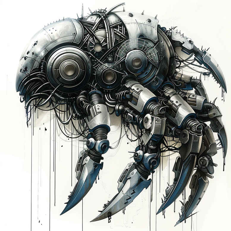 Biomechanical crab tattoo design blends the hard geometry of machinery with the natural contour of a crab, creating a dramatic fusion of organic form and engineered detail. The composition places a heavy exoskeleton core encased in plates, with interlocking gear rings, pistons, cables, and blade-like mandibles that read as both weapon and sculpture. The piece relies on a restrained black and grey palette, using high-contrast shading to carve volume and emphasize metal textures, rivets, and worn surfaces. Negative space is used strategically to suggest movement and depth, allowing the creature to breathe within the skin while maintaining a compact silhouette that reads clearly from distance. The biomechanical language here is precise yet expressive, inviting interpretations of resilience, symbiosis with technology, and the idea of evolution through engineered form. The crab’s stance and the overlapping hardware evoke a sense of readiness and protection, while the blades hint at danger and precision. For tattoo seekers, this design offers a bold statement piece suitable for larger canvases or as a centerpiece in a sleeve concept. As an AI-generated inspiration, this image demonstrates how a custom tattoo design can blend anatomical metaphor with cybernetic aesthetics, producing a timeless body art motif that remains legible in years of wear. The strong black massing makes it an excellent candidate for cover-up work, should a client wish to conceal previous imagery or reinterpret an existing tattoo with a high-contrast biomechanical upgrade. The integration of gears, bolts, and wires into the crab’s anatomy makes this a versatile concept adaptable to different skin tones and placements, while maintaining a coherent narrative of strength and transformation. In the broader context of tattoo culture, a biomechanical crab like this aligns with trends in mechanical realism and futuristic design, offering meaningful tattoos that appeal to fans of science fiction, engineering, and nature-inspired motifs alike. This design functions as a bold exploration of mixed media aesthetics, and because it is presented as an AI-generated concept, it also serves as an inspiring starting point for a custom tattoo design that a skilled artist can tailor to individual anatomy and storytelling goals.