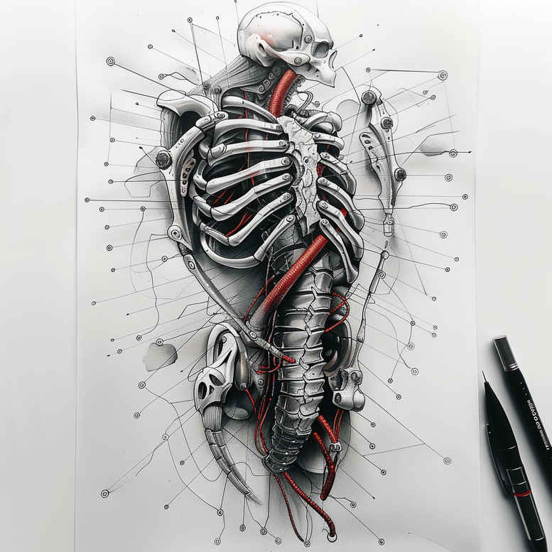 This biomechanical tattoo design fuses anatomical precision with machine-age engineering to forge a striking synthesis of flesh and gear. At the core is a realistically rendered skeleton, its ribcage clearly defined and its spine curling with a subtle, almost biomechanical sway. Winding around and through the bones are tubes, pistons, and cables that read as internal hydraulics, binding organic form to an engineered silhouette. A skull sits at the periphery, guiding the viewer’s eye toward the heart of the composition while adding a contemplative undertone about mortality and resilience. The palette remains in black and grey with restrained red accents that punctuate connectors and joints, giving the impression of live circuitry integrated with bone. The overall effect is graphic and legible from a distance, yet rich with micro-detail upon closer inspection—the threaded screws, the ribbed tubing, the fine line shading between vertebrae, and the seamless tension between metal and flesh. As a concept, this tattoo design embodies the biomechanical hallmark: the body as a vessel of upgrade, a metaphor for transformation, strength, and adaptability. The composition makes strategic use of negative space to create depth and to allow wraparound work on limbs or torsos, so the design can flow with natural contours. The art direction borrows from classic anatomy studies and modern digital rendering, achieving a crisp, high-contrast look that supports both refined shading and bold silhouettes. This is an AI-generated concept that demonstrates how a biomechanical tattoo can balance realism with engineered abstraction, offering a dramatic, statement-making option for large-scale projects while remaining faithful to the language of ink, linework, and shadow. For studios and collectors, it fits within biomechanical and graphic tattoo design portfolios, inviting conversations about technique, symbolism, and the evolving possibilities of body art.