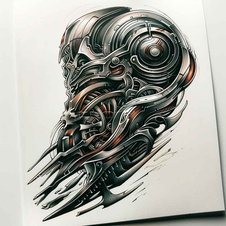 This biomechanical tattoo presents a sculpted skull fused with interlocking gears, tubes, and sinewy cables that bend with the anatomy, giving the impression of a machine-organic fusion beneath the skin. Rendered entirely in black and grey, the piece relies on crisp line work, high-contrast shading, and subtle highlights to achieve a convincing three-dimensional form thatreads as metal and sinew simultaneously. The central motif is a forward-facing skull whose jawline and temple areas intertwine with mechanical elements, while elongated tubes loop around the neck area in a dynamic rhythm that suggests movement and energy. The design employs a careful balance of positive and negative space to maintain legibility on a range of canvases, from forearms to backs, and the dense shading is offset by lighter gradients to ensure visibility as the tattoo ages. Conceptually, the image explores themes of transformation, resilience, and the fusion of biology with technology, making it a meaningful choice for those who identify with strength, endurance, and the idea of evolution through craft. From a tattoo design perspective, the elements are arranged to wrap cleanly around curves, preserving readability on the skin and enabling straightforward customization, such as color accents or initials. Although this is a concept tattoo, ready for refinement by a professional artist, the biomechanical aesthetic remains timeless within modern realism, heavy blackwork, and three-dimensional minimalism. The piece also fits well as a cover-up option due to its dense negative space and high-contrast silhouette. AI-generated concept art informs the initial sketch, which is then adapted to produce a durable, long-lasting tattoo. This design embodies the popularity of biomechanical tattoo motifs in contemporary body art, offering a striking, gallery-worthy statement that complements both minimalist and expansive sleeve projects.