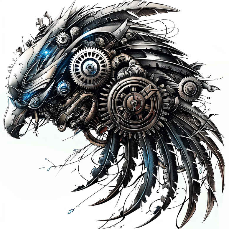 Biomechanical dragon head tattoo design fuses the sinewy anatomy of a mythical predator with engineered machinery. The focal point is the dragon’s head, rendered with overlapping metal plates, exposed gears, and curling cables that trace along the jaw and neck. The artist’s approach uses dense black and grey shading to create sculptural depth, while subtle blue accents simulate a cooled core running through the machine. Negative space is skillfully left around the crown and throat to let the mechanical elements breathe, giving the design a strong silhouette that can anchor a larger back or chest piece. The circular gears recur as motifs, guiding the eye across the brow and cheek, while riveted bolts, tube-work, and segmented armor imply a living engine beneath the scales. The composition balances brutal realism with stylized geometry, producing a piece that reads as both biomechanical anatomy and futuristic art. Symbolically, it speaks to themes of resilience, transformation, and the fusion of organic vitality with cybernetic precision, a popular motif in modern tattoo culture. As an AI-generated concept, it demonstrates the current capabilities of tattoo design software to craft intricate line work, shading, and texture that mimic metal and polymer with convincing fidelity. The project is highly suitable for cover-up on larger canvases, thanks to its dense shading and strong congestion of form that can mask old markings while offering a dramatic focal point. For collectors, this design represents a contemporary take on the biomechanical genre—bold, technical, and unmistakably inked—perfect for those seeking a striking, meaningful tattoo design that brackets the line between fantasy and machine, and it invites customization in scale or color for a personal, one-of-a-kind body art statement. It is a bold exploration of form and function, and the AI-generated nature of the concept highlights the evolving relationship between technology and tattoo artistry, reinforcing its place in modern body art culture.