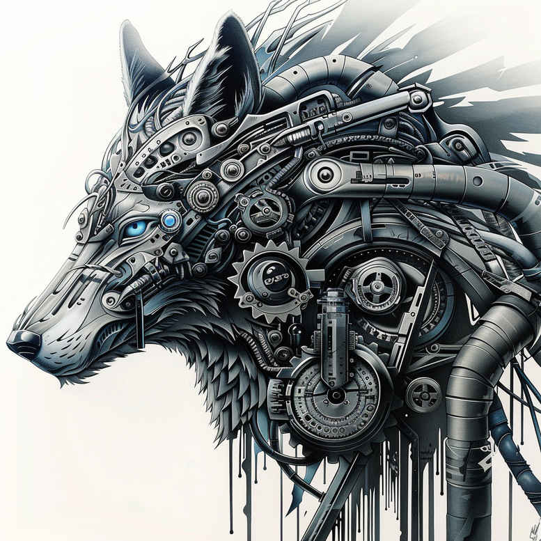 This biomechanical tattoo fuses an agile wolf silhouette with an intricate lattice of gears, pistons and tubing, a signature concept of the biomechanical style that appeals to admirers of industrial organic art. The main field features a left-profile wolf head anchored by a dense matrix of interlocking cogwheels and hydraulic lines, with cables weaving along the jawline and temple. Crisp line work defines the contour, while soft gradient shading creates tonal depth, giving the impression that metal and flesh share the same sinews. The design uses a restrained color palette of black and grey with cool blue-gray highlights to emphasize metallic edges, producing a high-contrast, three-dimensional look that remains legible as a tattoo from a distance yet rewarding up close. The arrangement balances central impact with careful negative space along the neck and behind the ear, enabling placement on the shoulder, chest, or back while preserving readability when scaled down. Symbolically, the wolf embodies instinct, loyalty and leadership, while the exposed machinery evokes resilience, transformation and the idea of the self upgraded through experience—a narrative often chosen for meaningful tattoos that celebrate personal growth or a second life of ink. The repeating gear motifs establish a subtle pattern that can be extended or contracted to fit different body areas, while the mechanical tubes guide the viewer’s eye along the composition as if tracing an energy conduit from snout to nape. As an AI-generated tattoo concept, it can be refined for different skin tones and sizes, marketed as a bold, cover-up-friendly design for older, heavily inked areas, and optimized for search terms such as tattoo design, black and grey realism, biomechanical tattoo, and custom tattoo design. The piece supports versatility, blending industrial aesthetics with raw animal energy and offering strong potential for a cohesive sleeve or chest composition.