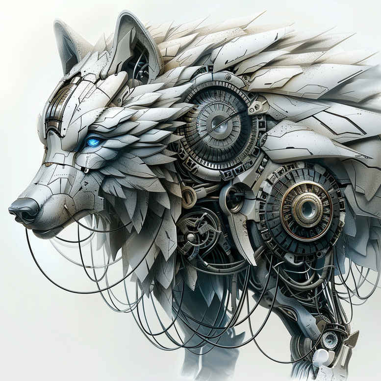 An expansive biomechanical wolf tattoo concept that blends animal grace with machine precision, designed as a bold cover-up option. The composition centers on a snarling head and forward-leaning torso of a wolf, carved from interlocking gears, circular pistons, riveted plates, and streaming cables that mimic sinew. The design uses a restrained monochrome palette of black and grey to emphasize metallic textures, with high-contrast shading to sculpt depth and volume across muscles and turbine-like joints. The gears repeat across the body, creating a hypnotic rhythm that guides the eye from snout to shoulder, while negative space reveals underlying skin as if the machine is breathing beneath the flesh. The lines vary from crisp outlines to soft shading and stippling, delivering a sense of three-dimensional form while maintaining strong legibility at larger scales for a dramatic back or chest piece and effective small tattoos. The biomechanical aesthetic speaks to fans of science fiction, mechanics, and body art that explores the fusion of organic and synthetic life; it embodies themes of resilience, power, and the idea that strength can be engineered. This tattoo design balances realism and stylization, offering a visually striking subject that can be adapted to different placements and sizes while preserving the intricate pattern of gears and cables. Often produced as an AI-generated concept, the piece benefits from algorithmic proportion studies that refine mechanical textures and joint articulation, ensuring a unique take on the biomechanical wolf motif. Overall, it serves as a robust, cover-up ready choice for those seeking a commanding, highly detailed design with a powerful silhouette and a timeless black and grey palette. The piece invites personalization through subtle shading of chrome highlights, weathered edges, and micro details, making it suitable for a large format like the back or thigh while maintaining readability when scaled down to smaller tattoo designs. In sum, this tattoo design merges primal animal force with futuristic engineering and stands as a bold statement of personal identity in the realm of body art. The integration of repeating gear motifs and cable detailing also makes it a strong example of pattern driven biomechanics that resonates with modern tattoo enthusiasts seeking meaningful tattoos and durable coverage options.