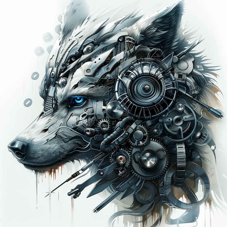 Biometric fusion of feral instinct and industrial precision defines this biomechanical wolf tattoo design, a bold study in black and grey that merges animal form with interlocking gears, pistons, and circuitry. The composition centers on a snarling wolf head, rendered with high-contrast shading that reveals meticulous linework and texture, while a cobalt-blue eye provides a piercing focal point that draws the viewer into the machine-woven gaze. Surrounding elements weave through fur and bone, turning organic anatomy into a tapestry of rotating cogs and threaded tubes, as if the wild spirit is being reimagined as a living engine. The artist employs a dynamic mix of soft gradient transitions and crisp edgework to create depth and motion, with negative space guiding the eye along the contours of the jaw, cheek, and temple. This tattoo design embraces the contemporary biomechanical aesthetic while preserving strong animal symbolism: resilience, cunning, loyalty, and the edge of humanity meeting machinery. The gears act as visual metaphors for cycles, progress, and the interconnectedness of nature and technology, while the blue eye hints at perception, focus, and the idea that vision can pierce through metal and myth. Created as an AI-generated concept, the piece offers a fresh approach to classic wildlife imagery, translating it into a highly detailed blueprint that reads both as a sculpture on skin and as a narrative about transformation. While ideal for larger canvases such as the shoulder, upper arm, or chest, its careful balance of negative space and dense mechanical texture makes it adaptable to ambitious sleeves or back pieces. The black and grey palette emphasizes form, texture, and shadow, ensuring the design remains legible over time, while the blue accent provides a striking counterpoint that anchors the composition. As a biomechanical tattoo design, it appeals to collectors of animal portraits, gear-centered tattoo art, and fans of modern body art that merges nature with industry. The concept, which sits at the crossroads of realism, fantasy, and industrial aesthetics, underscores a trend toward meaningful tattoos that fuse personal symbolism with technical craftsmanship, and it demonstrates how AI-generated art can inspire custom tattoo design with extraordinary detail and depth.