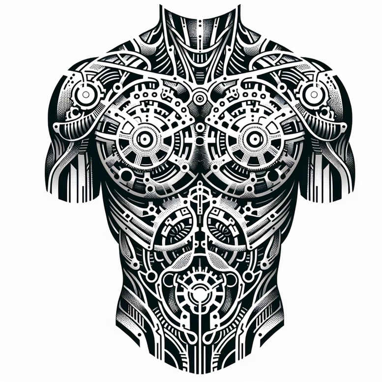 This biomechanical tattoo design fuses machine-inspired geometry with anatomical realism to create a dramatic chest piece. The composition centers on a symmetrical array of gears, cog wheels, pistons, and rib-like lines that appear to weave beneath the skin, producing the illusion of an inner mechanism breathing with the wearer. High-contrast black and grey shading emphasizes depth, contour, and the tactile texture of metal beside organic tissue. The torso becomes a canvas where mechanical components interact with natural form, blurring the line between flesh and engineered architecture. Circular motifs, interlocking rods, and sinew-like strands create rhythm and movement, guiding the eye from collarbone to sternum and back again. The design borrows from biomechanical and geometric styles, delivering a bold, contemporary aesthetic that remains timeless when inked on diverse skin tones. As a large-scale chest piece, it offers ample negative space for future additions or a sleeve extension. The choice of black and grey preserves a metallic sheen through crisp highlights and smooth tonal gradations, while the dense areas allow for lasting impact even at distance. This concept is perfectly suited for cover-up due to its layered geometry and substantial ink coverage, enabling existing tattoos to be concealed beneath a new, cohesive image. The piece is an AI-generated concept that invites interpretation about humanity’s fusion with technology, with gears symbolizing precision, progress, and interdependence between mind and body, and sinew motifs alluding to resilience beneath the machine’s exterior. For viewers, it communicates a sense of strength, innovation, and the tension between organic and mechanical forces, making it a meaningful choice for those seeking a statement tattoo that stands the test of time and adapts to different body shapes.