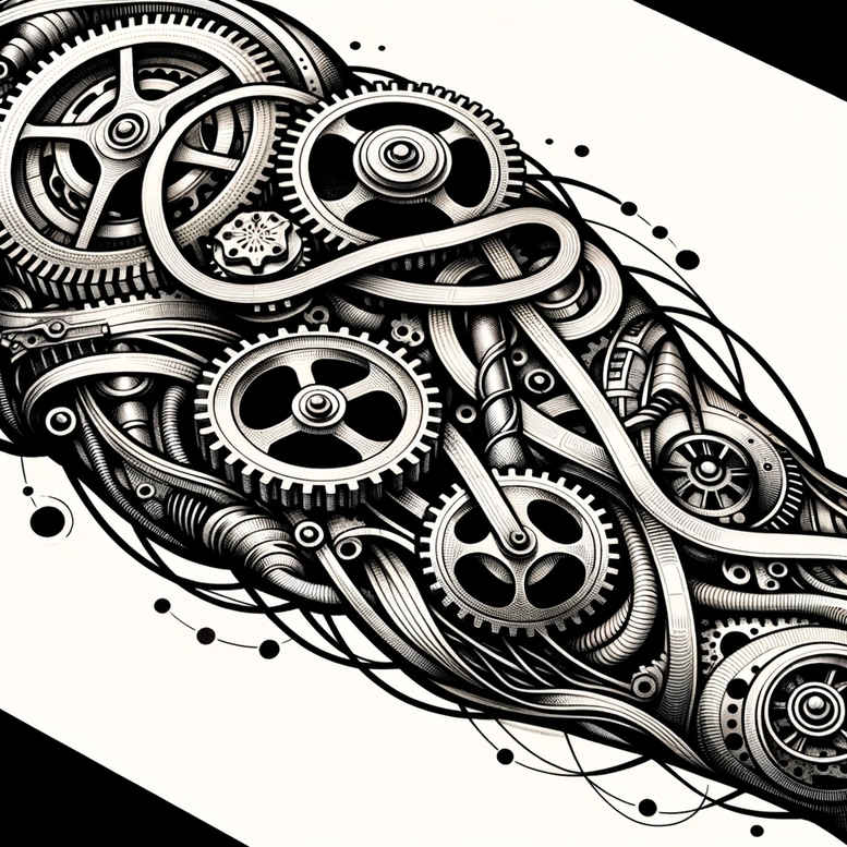 Biomechanical gears tattoo design—dense, precise, and highly kinetic in appearance—presents an intricate network of interlocking wheels, cog teeth, and slender conduits that twist along a major limb or the torso. The image uses bold black lines and deep gray shading to carve positive and negative spaces, creating a sense of depth and three-dimensionality that reads as both machine and anatomy. The dominant cluster of gears occupies the foreground, while supporting rings and cables weave into the background, producing a continuous rhythm that echoes the mechanics of a complex engine. The repetition of circular elements provides a pattern-like cadence across the skin, yet each gear retains individuality, ensuring legibility and longevity when tattooed over time. The composition intentionally embraces negative space to balance density, allowing the piece to flow with the body’s curves while preserving dramatic contrast typical of biomechanical styles. From a symbolic standpoint, the gears can represent precision, resilience, and the idea that human potential is powered by engineered energy; for some wearers, the design embodies the fusion of organic life with technology. The monochrome palette enhances the sculptural feel, as if the tattoo is carved from metal rather than ink, and the fine line work adds subtle texture that catches light and age gracefully. This project concept serves as a bold statement piece suitable for large surfaces, where the gears can wrap around joints and stretch across contours, creating movement across the skin. The design is versatile enough to be tailored to individual anatomy, with possible adjustments to gear sizes and cable paths to maximize impact. It is worth noting that this AI-generated concept showcases a high level of detail and a modern, industrial aesthetic, making it an ideal candidate for a cover-up on older, darker tattoos where strong blackwork can blend seamlessly with existing art.