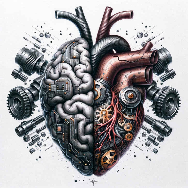 This biomechanical heart tattoo design fuses anatomical heart with engineered machinery to create a striking color-saturated chest piece. The left half presents organic tissue and vessels, while the right half is overlaid with metallic components—gears, pistons, valves, and tubes—rendered with high-contrast shading to emphasize depth and three-dimensionality. The color palette blends cool steel-grays with warm copper tones, giving a tactile sense of metal and living tissue. The composition centers on a symmetrical heart that acts as a fulcrum between life and machine, with tubing and wiring radiating outward to suggest motion and energy flow. The style is unmistakably biomechanical, drawing on influences from steampunk and industrial design, yet tuned for a modern tattoo aesthetic. This design works well on the chest or upper arm, where the central axis aligns with the sternum or biceps, allowing the viewer to appreciate the interplay of form and function as well as the craftsmanship of the linework and shading. In tattoo culture, biomechanical pieces embody the idea of human augmentation and resilience, while the color treatment adds a contemporary edge that helps the piece age gracefully on the skin. The image functions as an AI-generated concept to showcase potential directions for a custom tattoo design. For collectors seeking meaningful tattoos, this piece offers a narrative of physiology meeting technology, with clear symbolism of heart, strength, and machinery. The linework uses clean outlines with subtle cross-hatching and brushed-metal highlights, while the color work emphasizes contrast between coppery and silvery elements. Designed for large surfaces, it can be adapted for chest panels or sleeves and tailored to individual anatomy; the concept remains versatile for both color and black-and-grey tattoo design contexts, and illustrates how biomechanics-inspired tattoos can serve as bold, enduring body art.