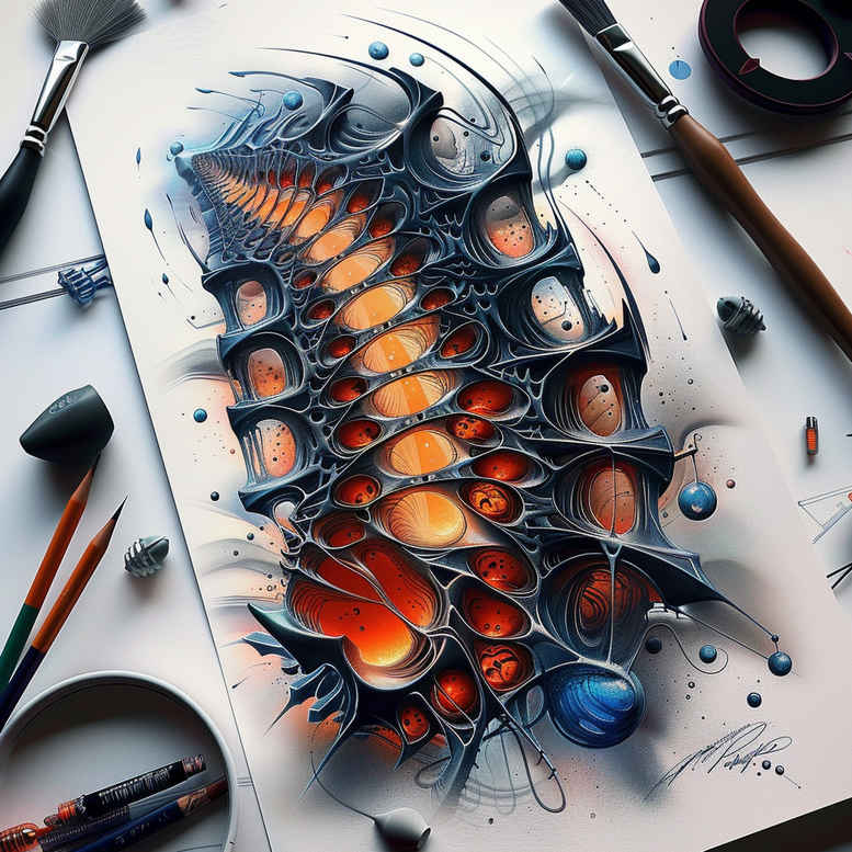 This biomechanical tattoo design blends human anatomy with machine-inspired geometry to form a single, continuous narrative that reads as both organ and engine. The central spine motif acts as a backbone for a cascade of interlocked gears, tubes and bolts that appear to fuse with living tissue, creating a dramatic collision of biology and engineering. Rendered in a stark black and orange palette, the piece relies on crisp line work, dense black shading and selective negative space to carve the mechanical components into a three dimensional form. The curvature of the spine guides the eye along a sequence of vertebrae-like gear segments, each gear hub resembling a joint capsule, while slender tubes weave through the composition, connecting elements much like arteries feed a cybernetic core. The orange glow is concentrated in the interior cavities, suggesting energy flow, heat and vitality beneath a chrome-like exterior. The overall silhouette reads as both visceral anatomy and engineered sculpture, inviting interpretation about transformation, resilience and the symbiosis of flesh and machine. In terms of technique, the design favors bold outlines, high-contrast shading and meticulous micro-details that hold up at several inches in size, making it suitable for large placements such as the back, rib cage or shoulder blade. The motif also accommodates variations in line thickness and negative space, enabling a tattoo artist to tailor texture and depth to different skin tones and body contours. Because the palette stays within black and a vivid orange, the contrast remains legible over time, enhancing longevity and readability. The concept is AI-generated, offering a solid foundation for a custom tattoo design, while remaining adaptable for refinement by a professional tattoo artist to suit personal symbolism and anatomical nuance. This piece is perfectly suited for a cover-up option given its dense dark areas, which can mask prior work while the new lines redefine the surface into a fresh biomechanical expression, ideal for clients seeking a bold, statement-making tattoo.