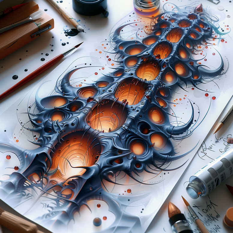 This biomechanical tattoo design presents a ribcage motif fused with organic gears and sinewy lines, rendered in a vibrant blue and orange palette. The composition threads a central spine-like column along the torso, with curved tubular shapes and porous cavities that emulate muscle and biomechanical architecture. The shading blends smooth gradient transitions and micro dotwork to create depth, with high-contrast edges to emphasize the mechanical anatomy beneath the skin. The repetition of circular voids forms a micro-pattern that adds rhythm across the piece, guiding the eye along the ribcage contour and into extending tendrils. The concept sits at the intersection of anatomy and machinery, invoking themes of resilience, transformation, and the intimate relationship between biology and engineered art. As a tattoo concept, this piece can be adapted to suit upper chest or back panels, with the gears representing hidden strength and the organic networks symbolizing life’s connective tissue. The use of blue and orange hues gives a vibrant, modern look while maintaining readability on the skin, and the overall style leans toward biomechanical realism rather than purely illustrative. For readers exploring meaningful tattoos or small tattoos, this design offers a bold statement that remains adaptable for different sizes. Occasionally this tattoo concept is AI-generated, which informs its crisp lines and consistent patterning. Intended for a professional studio, the design emphasizes clean line work, subtle color shifts, and durable placement across energy-rich muscle areas.