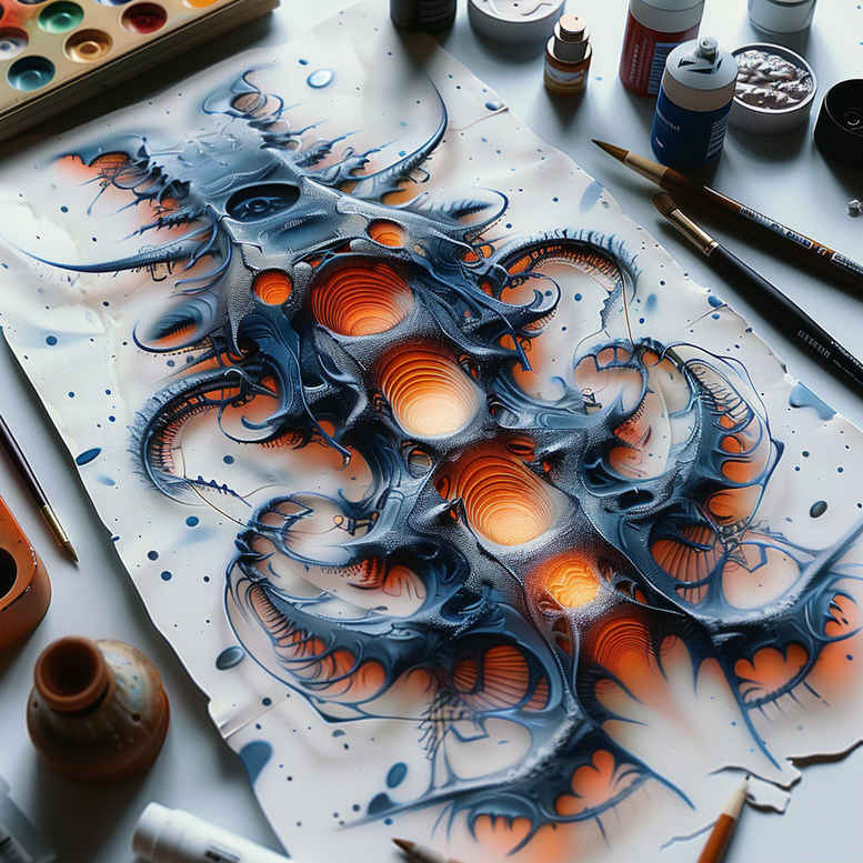 This biomechanical flame-lattice tattoo design is a color concept art that blends organic form with engineered geometry. Rendered in blue outlines with orange core accents, the composition reads as a vertical cascade of interconnected circles and tubes that weave through a lattice of mechanical detail. The color contrast gives the piece a striking, almost luminescent quality, while the shading builds depth and a three-dimensional feel that is distinctively biomechanical. The recurring circular motifs act as both structural anchors and visual rhythm, suggesting motion and repetition across the surface of the skin. Tubes and curved struts braid through the design, creating a sense of layered anatomy where sinew and machine meet. In this concept, flame-like elements emerge from the negative space between modules, adding heat and energy to an otherwise cool color palette. The overall silhouette works well for a back, chest, or sleeve tattoo, with strong focal points that can be scaled up or down depending on placement. From a symbolism standpoint, the fusion of flame and gear imagery speaks to transformation, resilience, and the synergy between biology and technology—a common theme for meaningful tattoos in modern biomechanical art. This AI-generated concept demonstrates how precise linework, crisp color layering, and controlled gradients can deliver a bold, graphic effect while preserving subtle texture. For practitioners, the design challenges include maintaining clean line work through aging and ensuring color longevity on larger canvases. The composition prioritizes a central axis, with radial symmetry of circles that can anchor a larger piece and invite additional elements such as script or floral accents. The interplay of negative space and dense color builds contrast that reads well from a distance and up close, ensuring readability as a statement tattoo. The concept balances sharp, machine-like geometry with the organic feel of light and shadow, achieved through fine line work and layered washes that emulate metallic surfaces. While this illustration serves as a concept, it translates into a market-ready commission with a clear design language for tattoo artists aiming to push technical boundaries.