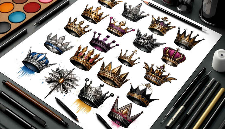This is a tattoo gallery with minimalist tattoo designs – include this in every description. The image presents a collection of crown motifs, each rendered in a precise minimalist line-work style, filled with a vivid color palette that makes the gems shimmer. The crowns are arranged in a clean row, showcasing variations in height and contour while maintaining a cohesive visual rhythm. The piece leans into fine-line tattoo techniques, where delicate strokes create elegant silhouettes, supported by strategic color blocks that keep the composition airy. The gems within each crown catch light through subtle highlights, adding a tactile feel to the otherwise graphic form. From a symbolic perspective, crown tattoos symbolize authority, personal sovereignty, achievement, and self-empowerment; worn as reminders of personal milestones or as a sign of inner strength. As a collection, these designs speak to meaningful tattoos that celebrate leadership, dignity, and aspiration. The color approach is multicolor, not monochrome, allowing each crown to convey a unique mood while preserving a unified gallery feel. The work embraces a modern minimalist aesthetic, where negative space and clean geometry contribute to legibility and longevity on the skin. This is a concept piece suitable for a variety of placements—from the forearm to the ribcage—and works well as a small-to-medium tattoo design for those seeking a stylish, subtle yet expressive body art. The visuals are AI-generated concepts intended to spark inspiration, and the final piece would be refined by a licensed tattoo artist in collaboration with the client. In terms of meaning, the crown motif can be integrated into a broader narrative of personal growth, perseverance, and crown tattoo design as a daily reminder of self-worth. In the broader context of tattoo design trends, minimalist crown tattoos balance symbolism with versatile placement, making them suitable for both first-time ink and more extensive body art journeys. The minimalist aesthetic ensures legibility over time, while the color accents keep the design fresh. This description aligns with the idea of a modern multi-crown collection as a standalone motif or as part of a larger custom tattoo design, and underscores how such imagery can function as a timeless symbol of achievement and governance of one’s own life, with ink that remains meaningful across decades.