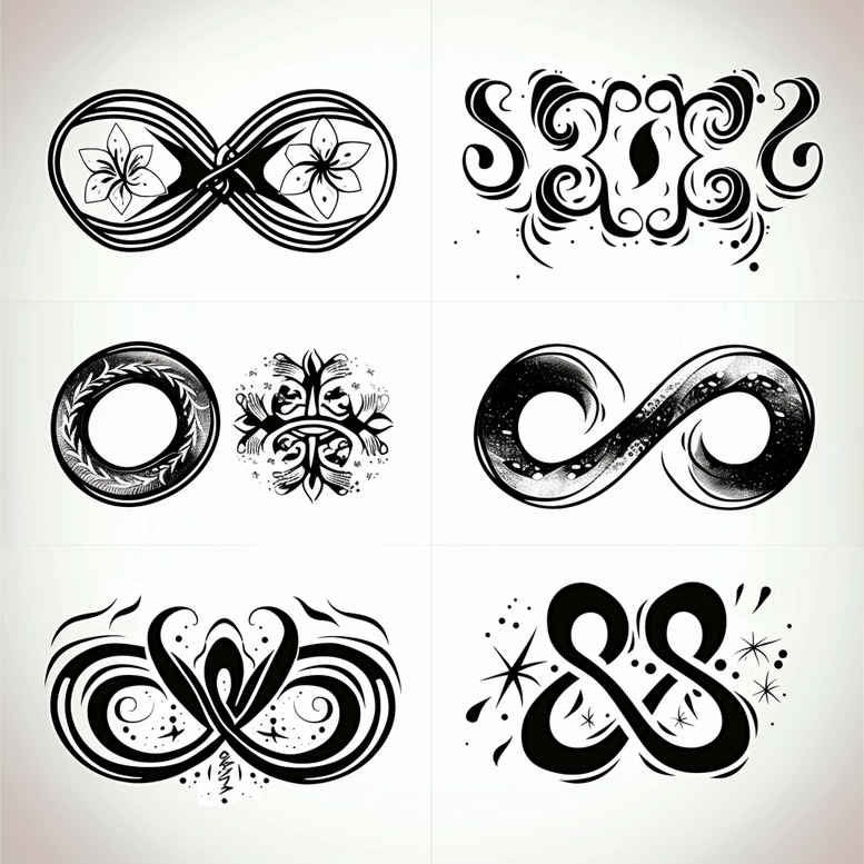 This is a tattoo gallery with minimalist tattoo designs. The collection shown features six black and grey fine-line studies that celebrate clean geometry and restrained linework. Dominant infinity motifs anchor the group, with looping shapes that convey eternity, connection, and continuity, while companion elements provide contrast and balance: a circle motif, a snowflake-like ornament, a stylized monogram, an ornamental swirl, and a bold ampersand. Each piece relies on precise, crisp lines and intentional negative space to achieve a quiet, modern aesthetic suitable for both small and larger placements. Symbolically, infinity stands for timeless bonds and resilience; the circle represents wholeness and cycles; the snowflake signals individuality and the beauty of unique patterning; the monogram personalizes meaning and identity; the swirl evokes motion and the flow of life; the ampersand embodies connection and companionship. The overall style is black and grey fine-line tattoo design language, emphasizing minimalism, balance, and legibility on skin as body art. As a gallery of AI-generated concept art, these are ideas for inspiration that a professional tattoo artist would tailor in scale, spacing, and weight to the wearer. Because the designs include heavy black areas, they are especially suitable for cover-up projects, enabling a clean transition from older work while maintaining a refined silhouette. The repeating pattern across pieces creates rhythm and cohesion, a hallmark of pattern-focused tattoo design that resonates with fans of minimalist ink. Collectively, the set blends timeless symbolism with contemporary craft, offering a meaningful path toward customized, small tattoos or statement pieces that remain legible over time in black and grey ink, while inviting further refinement in a commissioned tattoo design.