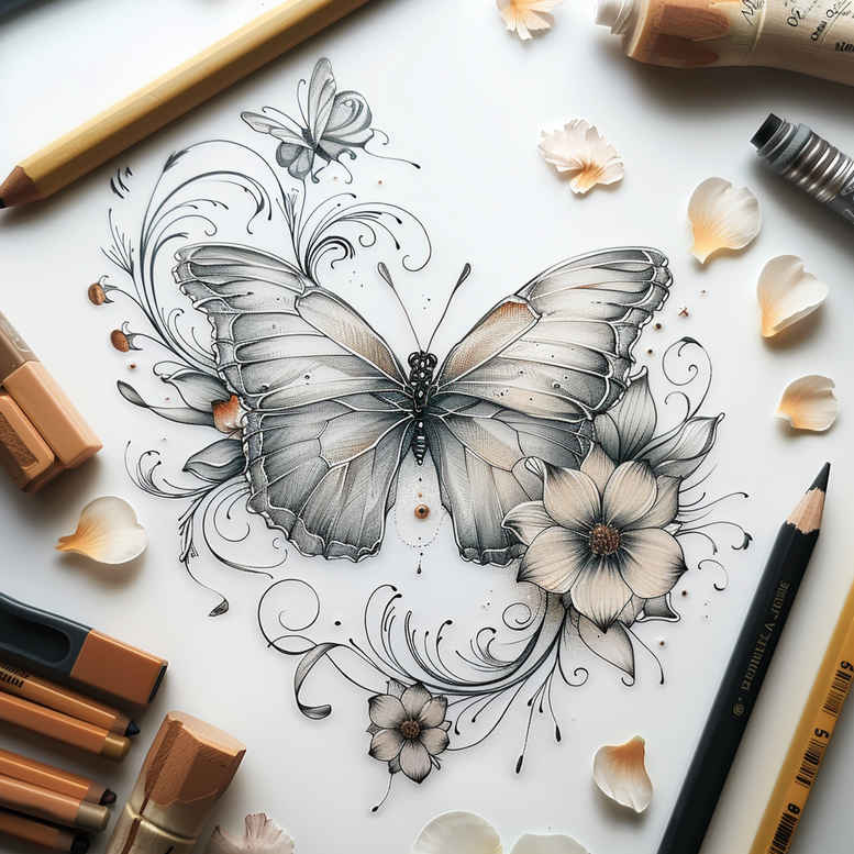 An AI-generated tattoo project concept featuring a fine line butterfly entwined with florals, rendered in black and grey on a white sketch page to resemble a transfer-ready design. The composition centers on a delicate butterfly whose wings are outlined with precise, even strokes, while accompanying blossoms and curling vines frame the insect with graceful movement. The line is intentionally fine, with restrained shading and subtle stippling to create depth without overpowering the airy feel of the piece, exemplifying classic fine line tattoo technique. This approach preserves legibility when reduced to a small tattoo size while also offering flexibility for larger applications. Symbolically, the butterfly embodies transformation and renewal, paired with flowers to signify growth, beauty, and the cycles of life—concepts that resonate with meaningful tattoos and make this a strong candidate for a bespoke tattoo design. From a technical perspective, the piece demonstrates balance between positive and negative space, crisp contour lines, and careful spacing that translates well into black and grey ink, ensuring clean aging with minimal blur. For clients seeking a custom tattoo design, this concept offers adaptable options: the butterfly can be scaled and oriented to suit the forearm, shoulder, or back, while flowers can be extended into a sleeve or kept as a compact motif. As an AI-generated tattoo project, it serves as an inspirational stem for real-world tattoo artists to refine line weight, proportionality, and composition. The inclusion of floral elements and pattern motifs supports discoverability under search terms such as tattoo, tattoo design, meaningful tattoos, fine line tattoo, flower tattoos, custom tattoo design, black and grey, and ink, aligning with trends in japanese-style and floral body art, yet remaining suitable for both minimal and more elaborate interpretations. If a client desires a more graphic take, the design can be simplified into bolder contours and clustered floral elements to maintain the butterfly’s silhouette while increasing contrast, and the pattern elements can be expanded into a larger japanese-style sleeve or kept as a cohesive small-piece centerpiece, preserving harmony between line precision and negative space.