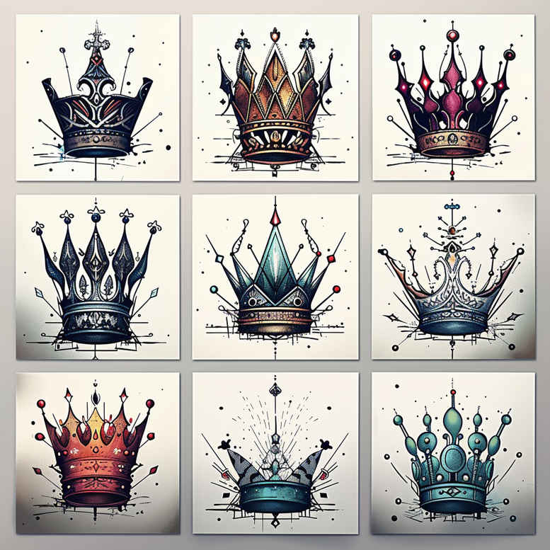 This tattoo gallery features minimalist tattoo designs and presents a collection of crown motifs rendered in fine line technique. The image shows a grid of crowns, each with crisp outlines, delicate shading, and gem-like accents in color. The crowns symbolize sovereignty, authority, victory, and personal leadership; they can signify achievement, responsibility, and a regal mindset that guides the wearer through life’s challenges. The repeated graphic pattern of crowns across the grid creates a rhythmic, almost tessellated cadence, emphasizing pattern and balance while inviting contemplation on power and identity. The color palette, when employed, uses jewel tones such as sapphire blues, ruby reds, and emerald greens to highlight the ornate elements without overwhelming the design, maintaining the refined look characteristic of fine line tattoo and color work. This concept is suitable for both small tattoos and larger compositions, offering flexibility for placement on wrists, ankles, or shoulders, and providing a versatile base for a custom tattoo design that can evolve with the wearer’s story. The minimalist approach relies on clean lines, negative space, and controlled contrast to convey elegance and legibility at various sizes, while the gemstones add focal points that catch light in real life. As an AI-generated concept, it explores how repetition and symmetry can transform a simple crown silhouette into a cohesive tattoo design narrative. The symbolism extends beyond royalty to ideas of legitimacy, protection, ambition, and self-empowerment, making these crowns meaningful tattoos for those who celebrate personal milestones. This description intentionally blends fashion with philosophy, inviting a deeper appreciation of line work, color balance, and symbolic storytelling in ink, and it demonstrates how a minimalist crown can become a timeless body art statement, especially when scaled and adapted to individual anatomy. Finally, this piece is part of an ongoing AI-assisted study of pattern repetition in tattoo art, highlighting how crown symbolism can be harmonized with contemporary micro-tattoo trends and the broader movement of meaningful tattoos within modern Japanese-inspired styles, black and color ink, and fine line tattoo practice. It also emphasizes that minimalist tattoo design can communicate strength with restraint, making it suitable for a wide audience seeking elegant but powerful body art.