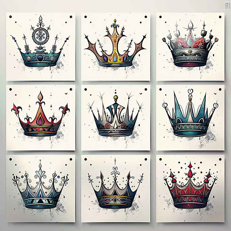 This is a tattoo gallery with minimalist tattoo designs – include this in every description. The nine crowns in this collection are rendered with a clean, fine-line outline and soft watercolor washes, delivering a refined yet expressive look that is quintessential to a modern tattoo design. Each crown serves as a symbol of sovereignty, personal authority, achievement, and self-worth, while the delicate lines emphasize restraint and elegance. The watercolor bursts introduce color psychology into the piece, with cool blues and warm accents suggesting balance between calm control and vibrant ambition. As an overall concept, these crowns convey the idea of inner royalty—the wearer’s ability to rule their own narrative with grace and discipline. The repeating motif across all panels highlights pattern continuity, making the designs ideal for someone drawn to a cohesive sleeve or a multi-location composition, yet equally suitable as standalone small tattoos for the wrist, ankle, or behind the ear. The minimalist approach keeps the design versatile for different skin tones and placements, while the fine-line technique invites a subtle, timeless impression that ages gracefully. These AI-generated concepts appear as ready-to-ink ideas, offering a glimpse into a broader spectrum of crown symbolism and personal meaning. In the context of tattoo meaning, a crown often marks personal milestones, leadership aspirations, or victories over challenges, and when rendered in a restrained, monochrome or lightly colored palette, it becomes a sophisticated statement piece. For those seeking meaningful tattoos with a universal symbol of power and dignity, this collection provides a stylish, low-commitment path to a custom tattoo design that remains legible and elegant over time. As a magazine-style exploration of body art, the visuals emphasize composition, line weight, and hue balance, ensuring the design reads clearly at small scales while still delivering a distinctive presence. The inclusion of watercolor texture adds depth without compromising the minimal aesthetic, making these pieces suitable for contemporary sensibilities while preserving the timeless allure of a crown motif.