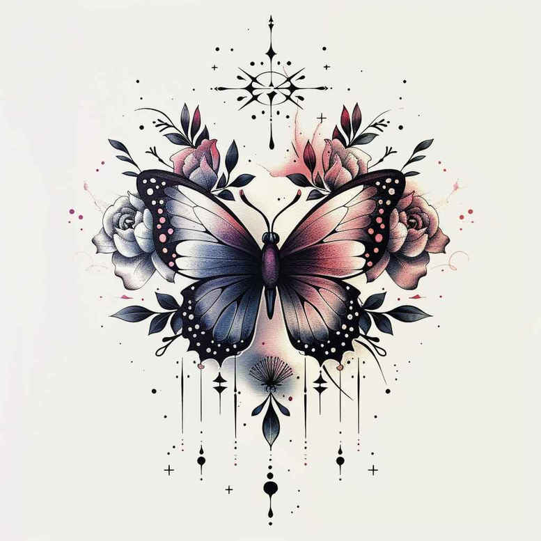 AI-generated tattoo project: a vibrant butterfly takes center stage among an arrangement of blossoms and geometric dotwork, rendered in a colorful watercolor palette. The design blends precise fine line technique with soft color transitions to create a luminous, airy composition. The butterfly’s wings display gradients of blue, pink, and purple with subtle stippling that adds depth, while surrounding flowers and leaves provide a natural frame and balance. Behind the subject, geometric accents and dotwork establish a modern pattern that enhances texture without overpowering the main figure. Symbolically, the butterfly represents transformation and renewal, echoed by the growth implied by the surrounding flora. This tattoo concept emphasizes versatility: it can function as a small-to-medium piece on the forearm or shoulder blade, and it can be adapted into a more graphic or Japanese-inspired interpretation by adjusting line weight and color saturation. The color-forward approach supports a full-color tattoo design, yet the piece can be translated into black and gray for a subtler option if desired. As a custom tattoo design, it speaks to enthusiasts seeking meaningful tattoos that blend nature motifs with contemporary patterning. The artwork integrates lotus flower tattoo elements, delicate petals, and a controlled arrangement of space to preserve readability on the skin. For collectors, the motif offers a balance between decorative patterning and symbolic meaning, making it suitable for a stand-alone tattoo or as part of a larger composition. It also serves as a flexible concept for small tattoos, flower tattoos, or a larger mural-style piece across the upper arm, back, or chest. This description highlights technique, symbolism, and adaptability while reinforcing that these are AI-generated tattoo projects exploring current ink trends, color fidelity, fine line precision, and the fusion of floral imagery with geometric patterning. The result is a comprehensive tattoo design concept that can be commissioned as a custom tattoo design and translated into multiple placements while maintaining readability and stylistic coherence.