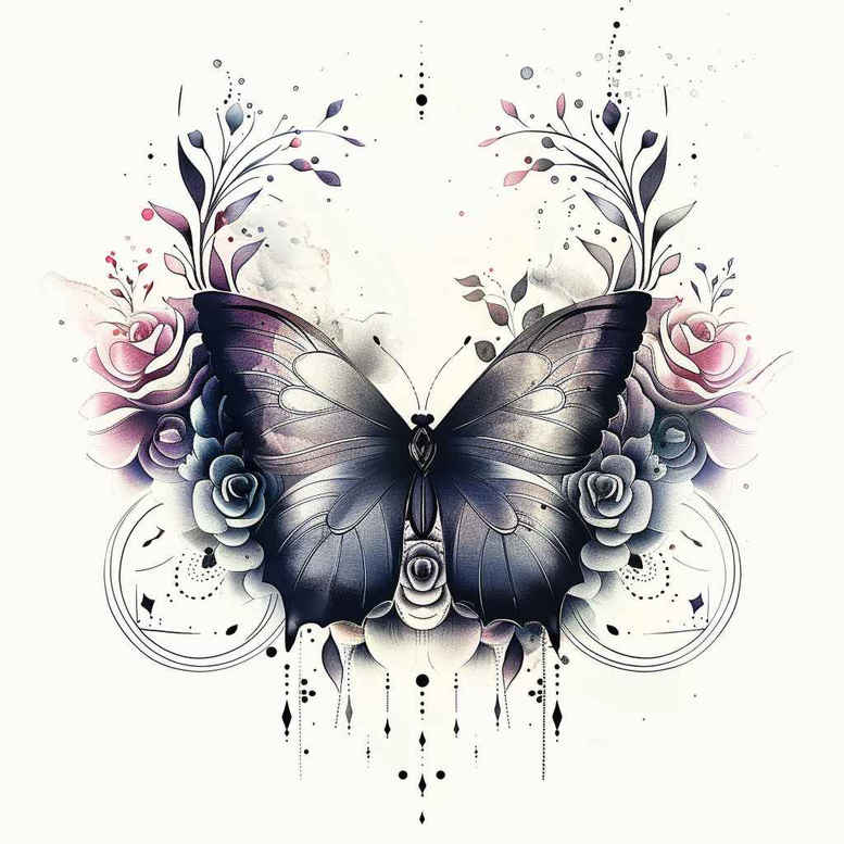 This watercolor-inspired tattoo design centers on a butterfly with wings rendered in black and grey, its forms softened by painterly washes that blend into a backdrop of roses and ornamental swirls. The butterfly’s contour is defined by precise fine line work, while gradations of shading build depth and a subtle sense of movement as if the wings are catching light. Surrounding the insect, pink and muted purple roses add gentle color contrast without overpowering the grayscale hero, and delicate circular motifs and filigree threads weave behind the subject, nodding to traditional ornamental tattoos and Japanese floral art. Symbolically, the butterfly represents metamorphosis and resilience, while the roses speak to beauty and memory, yielding a tattoo design with meaningful tattoos for the wearer. The arrangement works well on the forearm, upper arm, shoulder blade, or back, thanks to its balanced symmetry and negative-space opportunities; the watercolor washes provide a soft, organic feel that complements fine line detailing and realistic shading in black and grey. From a technique perspective, the piece blends clear line work with painterly ink—edges dissolve into color rather than hard borders—allowing a versatile adaptation for both small tattoos and larger, more intricate extensions. The design is a solid fit for flower tattoos and rose tattoo design categories, while its subdued palette keeps it consistent with black and grey tattoos, yet the pink accents offer a touch of color versatility for future color touch-ups. In terms of composition, the central butterfly anchors the piece, with roses radiating outward and the ornamental motifs providing rhythm across the canvas, all of which makes this a strong candidate for a custom tattoo design that can be scaled and reinterpreted for a Japanese style tattoo aesthetic. It also speaks to the broader themes of nature-inspired ink and fine line precision that modern tattoo collectors seek in small tattoos and medium-sized body art. Finally, to acknowledge the workflow, this description originates from an AI-generated tattoo project intended to illustrate how watercolor technique can be translated into tattoo design language for ink applications, enabling artists and clients to envision ongoing experiments in meaningful tattoos.