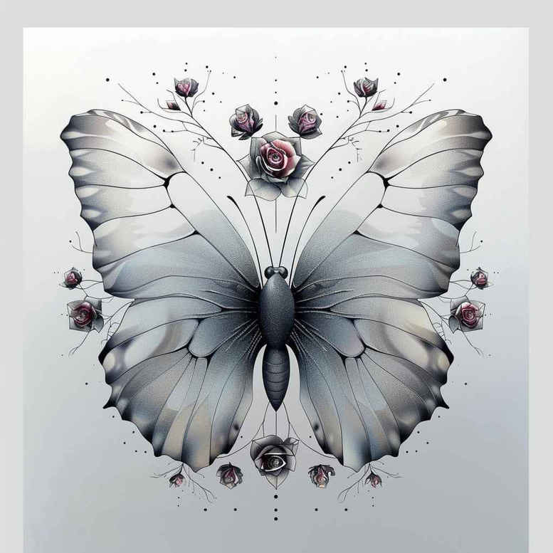 AI-generated tattoo project concept: a delicate butterfly with expansive pale blue-gray wings, subtle linework, and painterly washes around the edges. The forewings feature fine veins and gentle shading that suggest movement, while the hindwings taper into airy highlights. Surrounding the butterfly are small floral elements in muted pink tones that provide contrast without overpowering the central motif. The overall composition is designed for a compact placement such as the shoulder, forearm, or behind the ear, with room for fine detail at close viewing distances. The technique emphasizes a fine line tattoo approach—crisp outlines, restrained shading, and smooth gradient transitions—so the image remains legible over time, whether executed in black and grey or color. If rendered in black and grey, the piece reads as an elegant study in form and texture; if colored, the blue-gray wings and pink blossoms create a soft, ethereal mood reminiscent of botanical illustration. The design nods to graphic symmetry and pattern within nature, making it suitable for clients seeking a tattoo with both realism and decorative flair. Symbolically, the butterfly represents metamorphosis and renewal, while the floral accents can signify growth and beauty, making this a meaningful tattoo design with broad appeal for small tattoos and as a component of larger botanical work. Note that this is an AI-generated tattoo project concept.