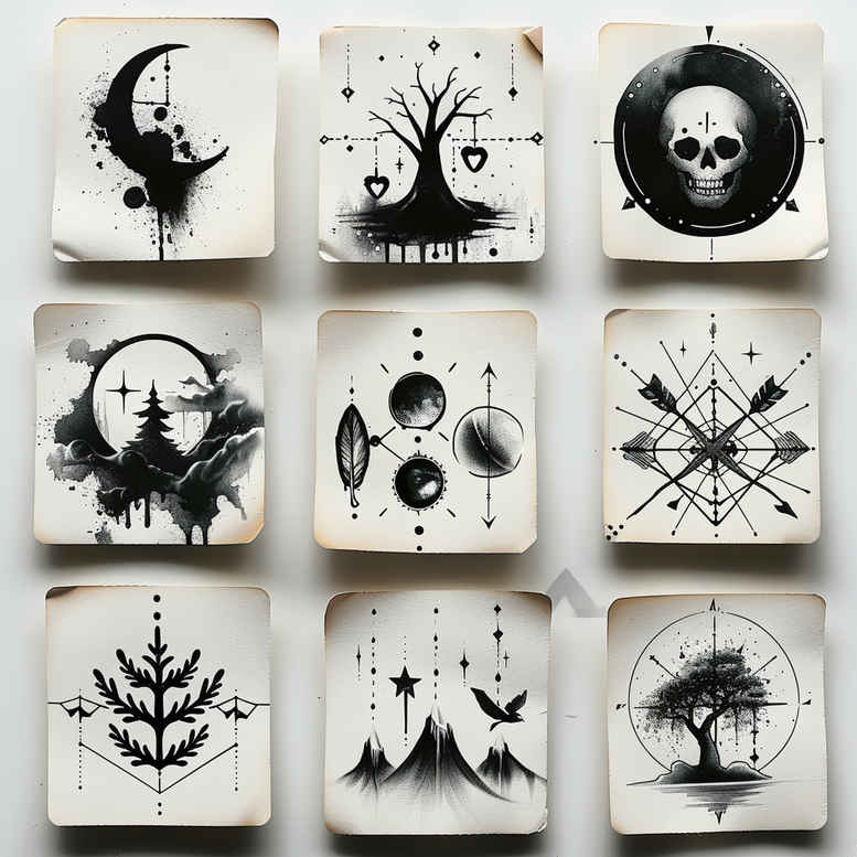 This is a tattoo gallery with minimalist tattoo designs. The nine panels arrive as a study in black and grey ink, where negative space is as deliberate as the solid forms, and each motif carries a loaded meaning while remaining suitable for small tattoos or larger compositions. The moon motif speaks of cycles, intuition, and change, traced in fine line precision that preserves readability on skin. The tree panel embodies growth, ancestry, and resilience, its slender branches suggesting branching paths and continuity. A skull encircled by a ring brings mortality into a restrained conversation, balancing edgy symbolism with wearable restraint. Wings extend from the central rhythm, evoking ascent and freedom, while circular and star motifs act as navigational symbols—guiding focus and intention. Other panels feature delicate plant forms and birds in flight, echoing renewal and connection between outer landscape and inner life. The overall composition emphasizes symmetry and balance, with thin lines and controlled shading achieving depth without heavy saturation, a hallmark of fine line tattoo practice within the black and grey spectrum. As an AI-generated concept, the gallery showcases imaginative reinterpretations of minimalist tattoo trends, reinforcing how pattern, geometry, and nature can coexist in a meaningful tattoo design. The recurring graphic patterns across tiles reinforce a cohesive collection, inviting viewers to imagine a unified sleeve or a set of complementary pieces across zones of the body. In sum, this curated set illustrates how minimalist line art can communicate longevity, intent, and personal myth, enabling clients to choose a concept that resonates while remaining adaptable for placement, scale, and line weight. The resulting imagery remains a strong source of inspiration for those seeking a timeless, versatile, and deeply personal tattoo design.