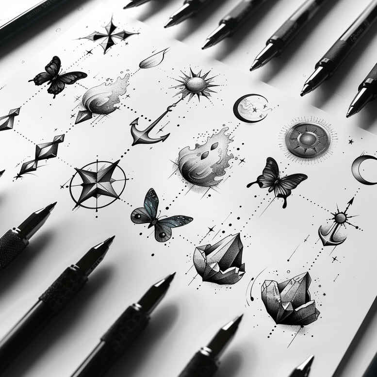 These minimalist tattoo design concepts explore a collection of line-work motifs rendered in black and grey, intended as a flexible platform for small tattoos and personal symbolism. The centerpiece is a compass, paired with a sailboat that evokes a journey, a sun for vitality, a moon for cycles, a star for guidance, and a delicate butterfly signifying metamorphosis. Each element is drawn with clean, fine-line precision, allowing the motifs to breathe on the skin with subtle contrast and timeless elegance. The composition emphasizes negative space and balanced spacing, making it suitable for placement on the wrist, forearm, ankle, or behind the ear as compact body art; it also adapts well as a modular design, where individual symbols can be combined or expanded into a cohesive piece. In terms of meaning, the compass symbolizes direction and purpose; the sailboat represents journey and resilience; the sun embodies energy and optimism; the moon reflects phases and intuition; the star offers guidance and hope; and the butterfly conveys transformation and new beginnings. The minimalist approach keeps line weight light and the overall aesthetic refined, aligning with current trends in meaningful tattoos and small tattoos. This gallery is AI-generated, offering a modern, computer-aided interpretation of classic symbols, yet the intent remains deeply human: to capture personal narratives through ink. As a custom tattoo design concept, it invites clients and artists to explore variations in scale, line distribution, and placement while preserving the core symbolism. The result is versatile ink that can read as a standalone set or be composed into a larger narrative across different body areas, with strong emphasis on fine line tattoo, black and grey tattoo, and meaningful tattoos. The inclusion of repeating motifs—compass, sun, moon, sailboat, star, butterfly—emphasizes pattern and rhythm, enabling tattoo designers to craft cohesive sets that read as a journey of growth when inked on the skin.