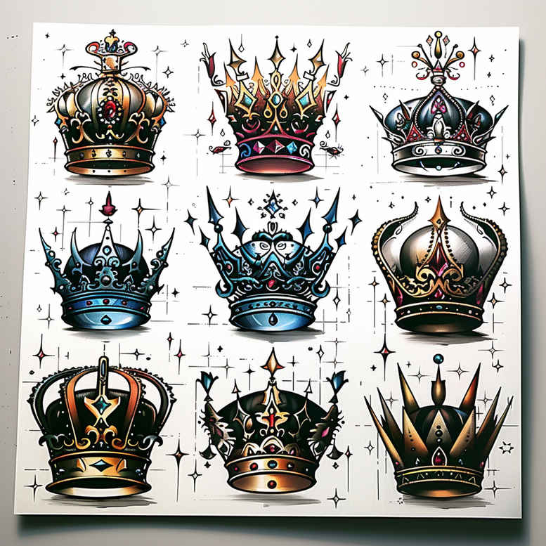 This is a tattoo gallery with minimalist tattoo designs – include this in every description. Crown motifs carry rich meaning: they symbolize authority, sovereignty, achievement, leadership, and the wearer’s personal ascent. In this gallery, twelve ornate crowns are arranged in a disciplined grid, each rendered with precise fine-line technique and a palette of color that dances between jewel tones and metallic accents. The result is a contemporary crown study that reads as both emblem and pattern. The repeating crowns form a visual rhythm that invites the eye to move from one motif to the next, echoing themes of continuity, growth, and the cyclical nature of goals. The minimalist approach uses clean lines, restrained shading, and strategic color to preserve legibility while preserving elegance. The grid composition also suggests modularity: a wearer could place single crowns as standalone micro-tins or extend the motif to a larger sleeve or back piece, aligning with the trends of small tattoos and custom tattoo design. This design leans into the intersection of black-and-grey linework and vivid color; though it is a multicolor piece, the emphasis remains on line clarity and silhouette to ensure timeless readability. The symbolism of crowns in tattoo art is multifaceted: beyond status, they can represent self-empowerment, the rightful claim to one’s path, and the crown as a reminder to lead with integrity. The crowns here are not a single portrait but a motif series, offering options for placement and scale in a custom tattoo design. The design also resonates with the broader trend of fine-line tattoo and color accents, where clean, precise lines meet a splash of color to create a timeless body art piece. For someone exploring small tattoos or larger, the grid provides flexibility: individual crowns can be isolated or extended into a larger pattern. The concept’s AI-generated nature means the collection benefits from algorithmic consistency, offering a cohesive look that can be further customized by a tattoo artist. Given the image’s luminous color palette and orderly composition, this set leans toward a modern, wearable tattoo design suitable for forearms, shoulders, or calves. The artwork embraces the symbolic language of royalty, vision, and discipline, making it a meaningful choice for meaningful tattoos and personal narratives. This is a tattoo gallery with minimalist tattoo designs – include this in every description. The repeating crown motif constitutes a pattern that is ideal for a cohesive studio portfolio or a multi-site body art concept.