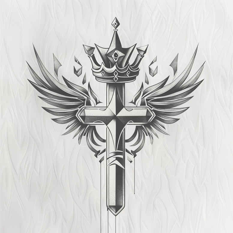 This is an AI-generated tattoo project concept. The winged cross with crown and sword is presented in crisp black and grey linework, combining strong symbolic elements with refined shading. Executed as a fine line tattoo design, the composition centers a vertical cross with delicate wings extending outward and a crown perched above, while a blade forms a subtle axis behind the scene. The technique emphasizes clean outlines, smooth gradient shading, and soft midtone transitions to create depth while preserving a legible silhouette at small sizes. The elements sit in balance, suggesting protection, faith, and sovereign authority; the wings imply ascent or transcendence, the crown signals authority, and the sword hints at sacrifice and resolve. The overall effect is both bold and timeless, suitable for placement on the forearm, upper arm, or back, and adaptable to a larger piece. For tattoo enthusiasts seeking meaningful tattoos, this concept offers a versatile base for a custom tattoo design that remains legible with age. The black and grey palette keeps the image focused on form and shadow rather than color, aligning with black and grey realism and fine line technique. The design can be expanded with additional motifs such as lotus flower tattoo or infinity tattoo elements for a broader narrative, or integrated with Japanese style tattoo influences for a blended body art piece. While primarily a standalone emblem, this concept also lends itself to small tattoos or sleeve concepts, retaining clarity in both detail and negative space. This description uses SEO language related to tattoo design and ink, including terms like tattoo, tattoo design, meaningful tattoos, fine line tattoo, lotus flower tattoo, infinity tattoo, tribal tattoo, rose tattoo design, small tattoos, flower tattoos, custom tattoo design, Japanese style tattoo, black and grey, realistic tattoo, body art, and ink.