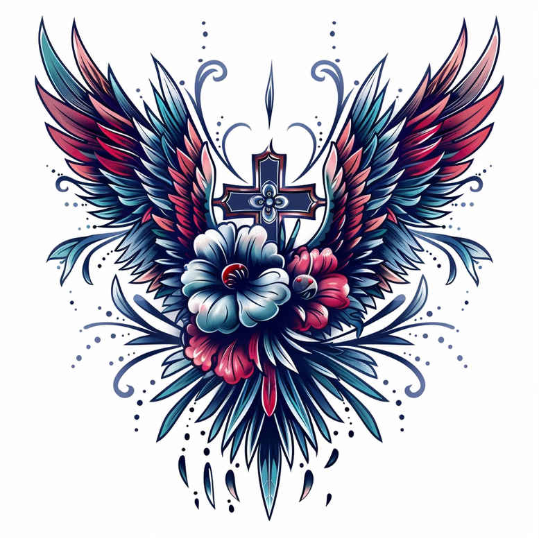 This winged heart lotus cross tattoo design is rendered in a precise fine-line style that balances structure with motion. A pair of wings sweep outward to form a heart-shaped silhouette, while a central cross anchors the composition. A lotus blooms at the base, its petals lifting toward the wings, symbolizing rebirth, faith, and resilience. The color palette uses cobalt blues and crimson reds for the feathers, with subtle shading to create depth while preserving crisp line work. The technique emphasizes clean outlines and restrained gradients so the image reads clearly on skin at both small and large scales. The motif blends spiritual symbolism with floral grace, making it versatile for placements such as the forearm, chest, or back, and adaptable to Japanese-inspired minimalism or more realistic rendering by the chosen artist. The wings suggest freedom and protection; the cross offers guidance; the lotus embodies purification and renewal. As an AI-generated tattoo project concept, it serves as a strong starting point for a custom tattoo design and meaningful tattoos, inviting collaboration on line weight, color saturation, and layout. It can be augmented with infinity symbols or additional flowers to tailor the narrative while keeping the crisp line work intact. For cover-up considerations, the bold silhouette and layered elements provide opportunities to obscure existing ink with a cohesive, visually striking result, though careful planning for placement and contrast is essential.