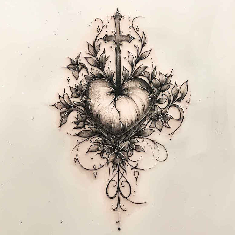 AI-generated tattoo concept presented as a cohesive heart-and-dagger design wrapped in florals, rendered entirely in black and grey. The focal point is a stylized heart pierced by a slender dagger whose blade runs vertically, crossing the heart at the midsection. Floral elements encircle the composition: roses in open bloom and subtle buds connected by curling vines and curling scrollwork that weave through the piece, creating motion and unity. The linework emphasizes contrast: crisp outlines anchor the design, while gradual shading and stippling produce depth and a sense of antiqued sophistication, suitable for both small tattoos and larger back or chest pieces. Symbolically, the heart conveys love and devotion, the dagger hints at betrayal or sacrifice, and the surrounding roses and vines symbolize resilience, renewal, and growth. The pattern-like arrangement of leaves and filigree adds a decorative quality that can be adjusted for different placements without losing readability. Technique-wise, this concept relies on traditional black and grey methods with clean, precise lines and controlled gradation to maintain legibility as the tattoo scales. Because of its dense dark areas and bold negative space, the design is an excellent candidate for cover-up work: strategic shading can mask previous ink while preserving a dramatic visual impact. This is an AI-generated tattoo project concept intended to explore a timeless motif with modern refinement, and it can be tailored to personal meaning by swapping in initials or dates during a custom tattoo design session. For discovery, this tattoo blends influences from classic tradition, Japanese floral sensibilities, and contemporary fine-line aesthetics, offering a versatile palette for meaningful tattoos, rose tattoo design, and small tattoos alike. The practical takeaway for inkers is to plan a clean transition between the dagger’s metallic sheen and the velvety petals, ensuring smooth gradients on skin tone variations. In short, the piece balances romance and risk within a controlled black and grey spectrum, delivering an emblematic tattoo design that remains legible and impactful on different canvases while remaining perfect for cover-up applications.