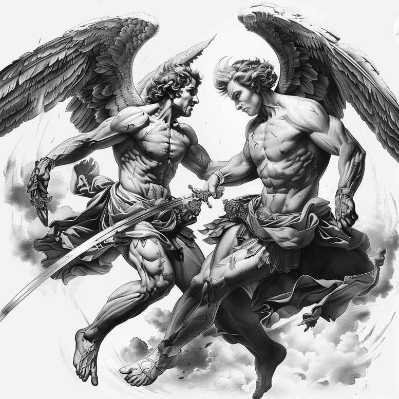 Rendered as an AI-generated tattoo project, this concept presents a pair of winged, armored figures locked in a mythic confrontation, drawn in a stark black and grey palette. The engraving-inspired linework relies on crisp outlines, varied line weight, and dense cross-hatching to create depth without color, delivering the tactile feel of old master plates translated to modern skin. The central scene features two winged figures clad in plate armor, their muscular forms tense as they clash around a silent focal point, while wings sweep overhead and frame the moment with opposing arcs. A textured, cloudy backdrop provides atmosphere and contrast, using stippling and subtle shading to push the figures forward. The composition reads like a story told in silhouette and texture, balancing negative space with dense detail so it can scale gracefully from small placements to larger back-piece silhouettes. For meaningful tattoos, the symbolism can be tuned: protection, struggle, renewal, or celestial guardianship, depending on how the client engages with the imagery. The design is suitable for a cover-up because the heavy shading can effectively obscure an existing tattoo while the strong lines maintain legibility over time. As a packaging note, this concept demonstrates how a classic mythic motif can be reimagined in contemporary tattoo styles, offering a versatile template for a bold, timeless piece. In short, this line-driven, black and grey tattoo study emphasizes form, motion, and mood, making it a compelling option for custom tattoo design that speaks to fans of fine line tattoo, realistic tattoo aesthetics, and traditional engraving-inspired body art, and it doubles as a robust example of ink-ready cover-up work.