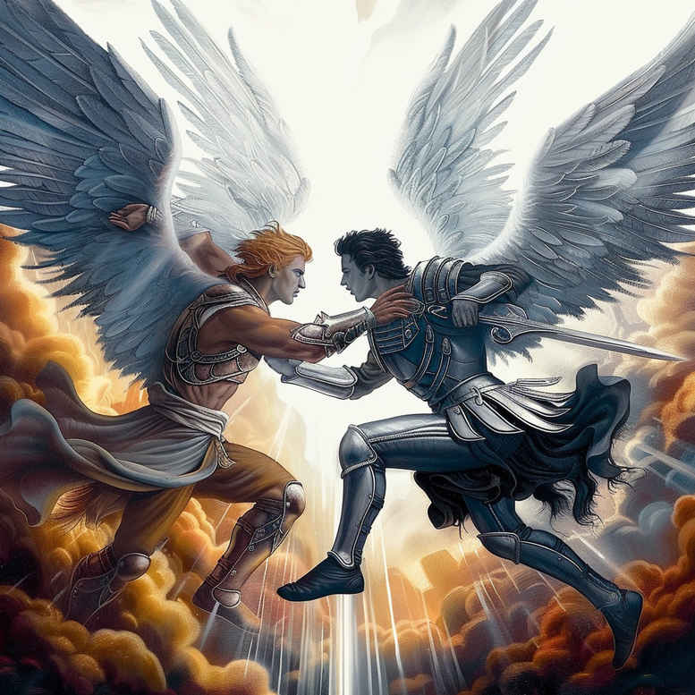 AI-generated tattoo project concept presented as a celestial duel between two winged angels, designed for a bold narrative body piece. The description emphasizes a highly realistic tattoo design approach that leverages controlled shading, crisp line work, and layered grayscale or color values to render depth and motion. Central figures wear blue-tinged armor and expansive white wings that carve an arresting silhouette against a backcloth of amber embers and a cool sky. The composition uses diagonal flow and negative space to guide the eye from the glint of the sword to the flare of the wings, while flames and clouds frame the scene as a vignette suitable for a large back, chest, or sleeve panel. In color, the palette can stress warm contrasts—fiery copper and gold tones against deep shadows—while in black and grey the study relies on smooth gradients, stippling, and feather texturing to evoke metallic surfaces and the softness of plumage. The design reads as a timeless mythic encounter, embodying themes of protection, ascent, and conflict—readers may interpret it as a personal anthem of inner struggle or a pact with higher powers. For tattoo collectors seeking meaningful tattoos, the piece offers a dramatic, story-driven image that translates well into a Japanese style tattoo or tribal rhythms, or into a contemporary realistic tattoo. It also adapts to small tattoos with careful scaling or to a dominant sleeve with bold negative space and crisp linework that age gracefully with ink. The listed elements—angel, wing, sword, armor, flame, cloud, and sky—provide a cohesive symbolic core, while the option of color or grayscale execution ensures customization to placement, skin tone, and personal meaning. As an AI-generated tattoo project concept, it aims to convert to ink smoothly, preserving legibility, motion, and contrast at various sizes, and inviting artists to explore epic, meaningful tattoos that fuse fantasy with spirituality.
