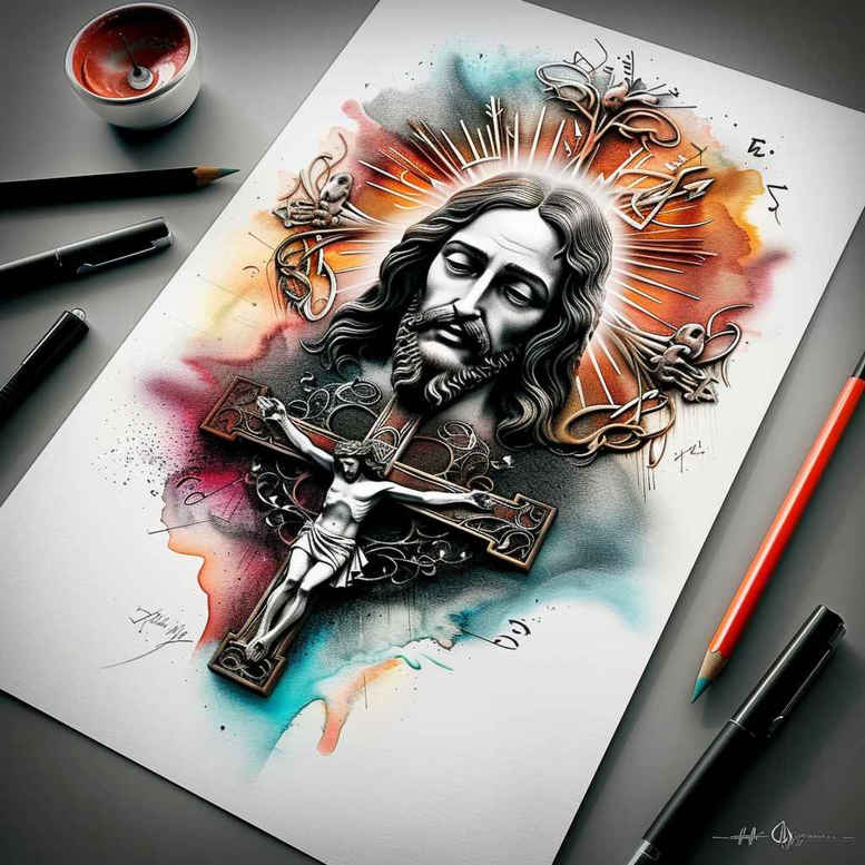 This AI-generated tattoo project concept presents a grayscale Jesus Christ portrait rendered with meticulous realism, where soft shadows and crisp line work capture a serene, contemplative expression. The crown of thorns encircles the brow as a quiet emblem of sacrifice, while the cross anchors the composition in a timeless gospel narrative. Surrounding the sacred figure, a vibrant watercolor wash bursts with luminous blues, pinks, teals, and golds, creating a divine halo of color that elevates the solemn subject without overpowering the grayscale focal point. The juxtaposition of black and grey realism and painterly color yields a striking harmony that speaks to contemporary religious tattoo aesthetics, blending fine line precision with broad, expressive pigment. This tattoo design embodies meaningful tattoos by conveying faith, endurance, and redemption in a form that remains adaptable for various placements—from the upper arm to the chest or back. As an AI-generated tattoo project concept, it invites interpretation: the restrained portrait invites quiet reflection, while the luminous backdrop suggests spiritual illumination pouring over the sacred figure. The visible elements—Jesus, cross, and crown—work in concert to communicate sacrifice, hope, and eternal meaning, making it an impactful choice for those seeking a piece that honors tradition while embracing modern body art trends. Technically, the piece relies on high-contrast shading to define facial contours, delicate feathering around the hair and beard, and translucent watercolor layers that bleed softly at the edges to fuse subject and atmosphere. For tattoo enthusiasts seeking a meaningful tattoo that blends realism with watercolor ink, this design demonstrates how black and grey portraits can coexist with color washes to produce a timeless yet contemporary statement. It exemplifies a custom tattoo design ethos—versatile for small to medium scales, suitable for a variety of bodies, and capable of resonating with collectors of traditional religious iconography and modern ink alike. As a whole, the work balances reverent symbolism with an editorial aesthetic, ensuring the piece translates beautifully into a tattoo that is both enduring and visually dynamic in ink.