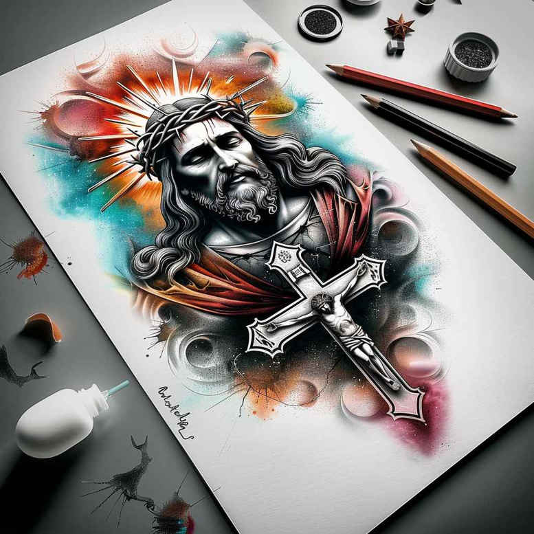 This AI-generated tattoo project concept presents a radiant portrait of Jesus Christ, rendered with a cross and a crown of thorns in a dynamic watercolor style. The central figure emerges with a calm, compassionate gaze, his features carved with soft shading that blends into a halo of color, as if light itself were caressing the ink. The cross sits behind him as a symbol of sacrifice and enduring faith, while the crown of thorns threads through the composition, reminding the viewer of endurance under trial. The background bursts with cerulean blues, warm ambers, and emeralds, created by careful splashes and feathered edges that mimic liquid pigment on paper. Surrounding the scene are familiar tools of the tattoo artist’s trade—a set of brushes, a few cups of ink, a pencil, and a sheet of sketch paper—emphasizing that this is a concept design for a real tattoo. The image reads as a study in contrast: the stark lines of the cross and the thorn crown against a soft, painterly aura, which enhances clarity when translated into skin. The rendering uses a mix of sharp line work and luminous color to achieve a balance between reverent realism and stylistic flair, suitable for a detailed tattoo design or a fine line portrait. The symbolism is layered: Jesus as the focal point signifies mercy and salvation; the cross anchors the composition in Christian faith; the crown of thorns nods to endurance and redemption. For enthusiasts of meaningful tattoos, this piece functions as a sophisticated, adaptable concept that can be scaled for small or large placements, while preserving the essential iconography. It also serves as a reminder of the power of art to translate sacred narratives into wearable body art, a fitting candidate for a custom tattoo design or a commemorative piece. This project is AI-generated and intended as a starting point for a real tattoo, inviting collaboration with a skilled tattoo artist to refine shading, texture, and line weight for skin. If you seek a vibrant, spiritually charged tattoo that harmonizes realism with painterly expression, this concept delivers a compelling template that can be tailored to personal faith and style. It doubles as a versatile cover for future skin art, if desired, and speaks to lovers of religious iconography who value both tradition and modern technique. The message of hope, resurrection, and divine love radiates through the composition, making it a high-impact tattoo design suitable for display on the chest, back, shoulder, or forearm.