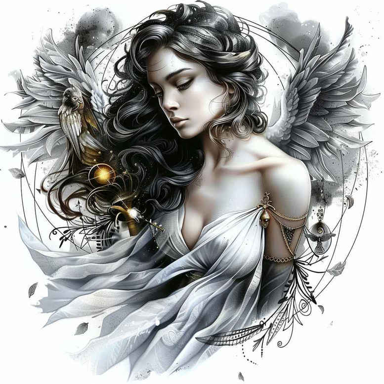 AI-generated tattoo project concept: this image presents a refined fantasy study designed as a tattoo idea. A poised woman with large feathered wings is rendered in black and grey with soft shading and precise linework. The wings unfold with layered feathers, while flowing fabric hints and a subtle glow orb near her hand add movement and symbolism: guidance, transformation, and inner light. The composition blends realism with decorative patterning, allowing it to be translated into a standalone piece or a sleeve motif. The monochrome palette emphasizes contrast, negative space, and delicate fine line details that suit small tattoos as well as larger body art. Designers may incorporate lotus petals, floral accents, or abstract swirls within the wing structure to tailor it to personal meaning. The piece reads as a modern tattoo design rooted in classic motifs: wings, female figure, and ornamental filigree, while nodding to Japanese style ink and black and grey technique. It also offers opportunities for a cover-up with strong shadow blocks where scars exist or to integrate existing tattoos into the new composition. This concept is suitable for a custom tattoo design that respects anatomy and flow, ensuring line weight and shading adapt to skin over time. Note that this is an AI-generated tattoo project; it serves as a starting point for client discussions, design refinements, and practical tattoo planning. The design emphasizes balance between figure and pattern, providing a versatile canvas for a back piece, shoulder, or forearm, and inviting collaboration on size, placement, and individual symbolism. Keywords to explore include tattoo, tattoo design, meaningful tattoos, fine line tattoo, lotus flower tattoo, infinity tattoo, tribal tattoo, rose tattoo design, small tattoos, flower tattoos, custom tattoo design, Japanese style tattoo, black and grey, realistic tattoo, body art, ink.